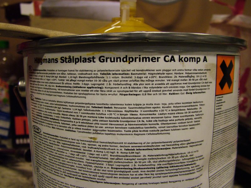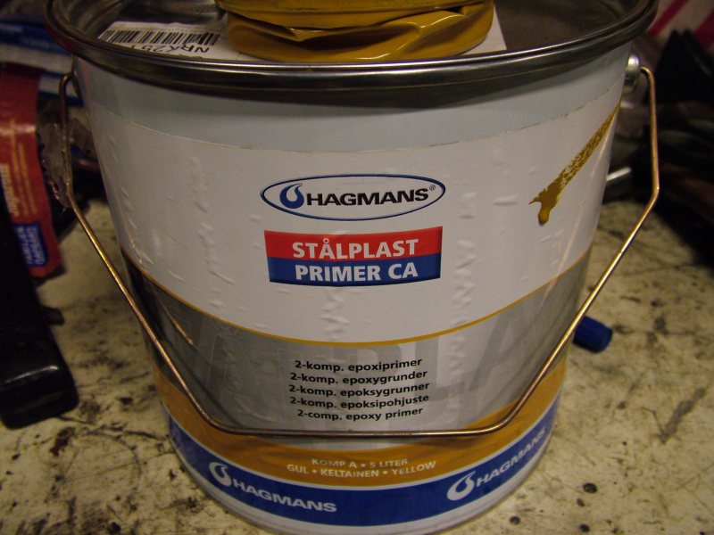 Hagmans CA i kräkgult är ju tydligen den som de flesta använder. Jag var och handlade mig tio liter för att ha till Pontiacen, men när jag kom hem konstaterade jag att texten på spannen känns lite tveksam - där står ju inget om att den är avsedd för metall?