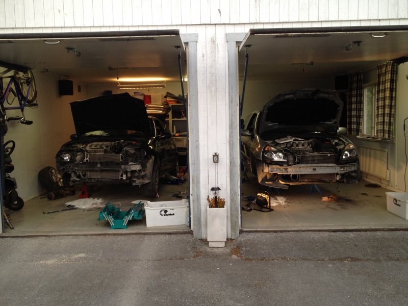 Har skruvat till och från någon vecka och det börjar likna nått. Det mesta gick att plocka över utan problem. Höger fjäderben var stukat i fästet, jag lämnade det till lokala smeden och han fixade till det. Skall hålla ett öga på det för att se att det håller som det skall (är egentligen inte orolig men...). Ny oljekyl blev det också, den gamla hade lite slitningar och jag tyckte det verkade dumt att chansa på att den skall hålla tätt under belastning. Plockade ur denna lite mer än vad jag gjorde med den svarta, skall försöka väga den på SBP vid tillfälle. Jag kopplade även ur samtliga airbags av en viss anledning vill ju inte riskera an ny stol eller instrumentbräda bara för att man kör på lite curbs.