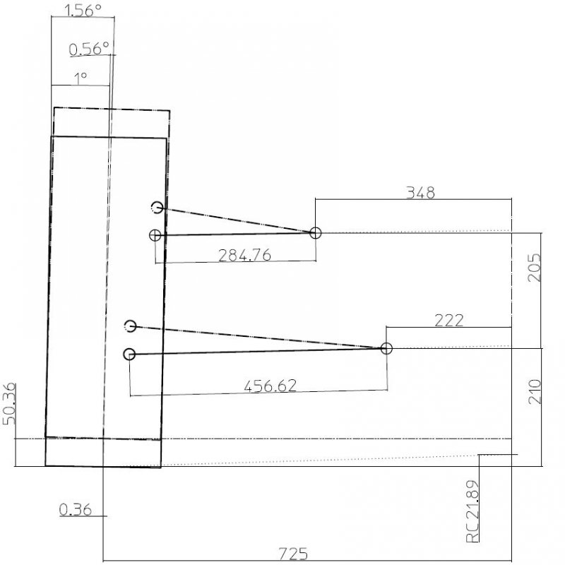 Har testat lite värden och kört simlueringar. Har lyckats få ner spårviddsförändringen rätt ordentligt (0,36). Camberförändringen med ca 50mm infjädring är 0.56 grader. Antar att jag bör ha mer för att öka trycket på yttre hjulet i kurvor? Funkar det så? Jag förstår att vilka värden jag ska ha beror på vilka vägegenskaper jag vill ha i bilen, bilen blir en liten låg bil med mittmotor och därför är en "sportig" väghållning väsentligare än terrängegenskaper. RC hänger ihop med tyngdpunkten och jag försöker få denna så låg som möjligt. Jag har inte tänkt mig att bygga in antidive eller liknande i geometrin. Drivpaketet består av, jämfört med en bilmotor, en lätt hojmotor (ca 90kg) och totalhöjden på bilen blir strax över metern, förutsättningar för låg tyngdpunkt finns alltså. Som ni ser på skissen blir det inte mycket till plats för fötter/pedaler mellan A-armarna, denna geometri tar alltså en del plats "på längden". Det funkar nog för min del, känns ok att den blir lite längre bara den går som ett "strykjärn". Hoppas på feedback på skissen jag bifogar och lite tips om ni anser geometrin verkar vettig och vad ni anser jag borde "se över".