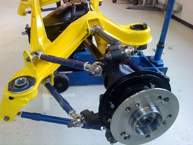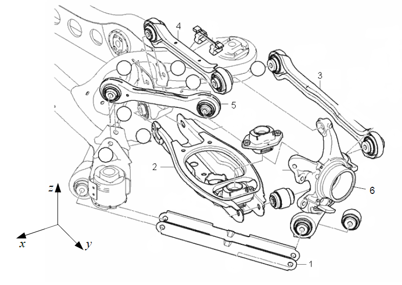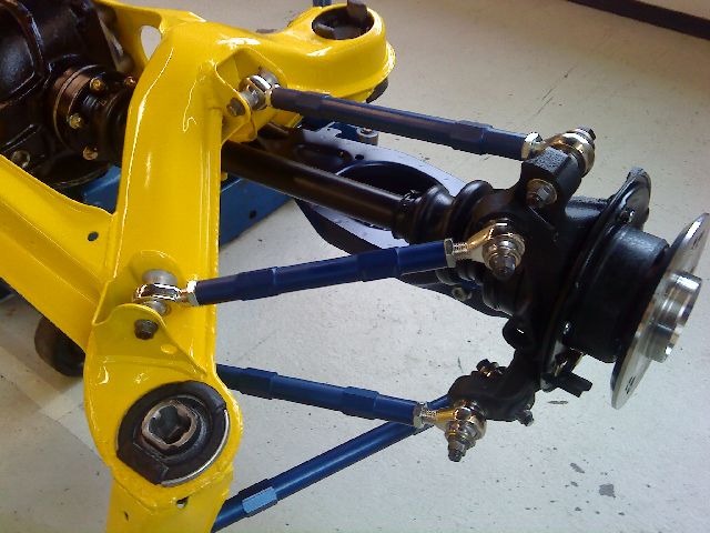 Sen delar inte lederna jämt på krafterna heller (större krafter i de nedre om man nu vill "optimera") och ute i uprighten ser de flesta lederna ut att vara fästa i single shear vilket inte är särskilt gynnsamt för skruven genom lagret. Har du någon bild på ursprungsbussningarna ute i uprighten? Om det är möjligt skulle man kunna tänka sig sfäriska lager i uprighten och U formade ytterändar för att åstadkomma vettigare belastning på skruven, men det flyttar möjligtvis rotationspunkter. Multilänk är för övrigt jävligt komplicerat, jag och en kursare modellerade en BMW (e90 om jag minns rätt) multilänkbakvagn som exjobb, den beter sig vääldigt annorlunda med stela leder kontra bussningar (det är rätt många ingenjörstimmar bakom bussningarna för att få "rätt" kinematik, ska se om jag kan leta fram lite kurvor). Relativt snarlikt utförande: