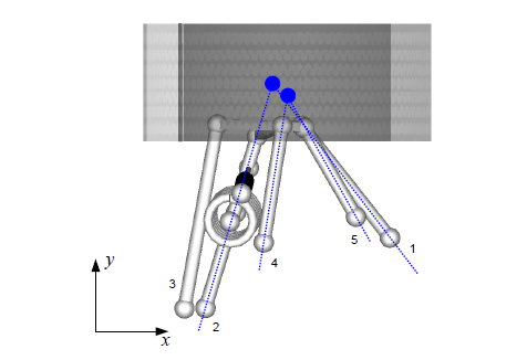 De simulerade heldragna linjerna är stel geometri (effektivt sfäriska lager och axlar utan deformation), medan punkterna är uppmätta i rigg på fordonet.
