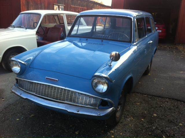 Fin original 1963 Ford Anglia Estate 106E. Bilen er svensk från början og har Svenska papper. Bilen er i fint skick , saknar at bli samlat litte efter målaren. Lackerat i Fords originale ljusblå färg. Bilen er komplet och har litte ekstra delar med. Bilen startar lätt och går fint at köra. Pris - 25.000,- Dkk. Bilen Finns i Köpenhamn , 1 mill från öresundsbron. Mvh.Nikolaj Mortensen 0045 - 50 90 67 10