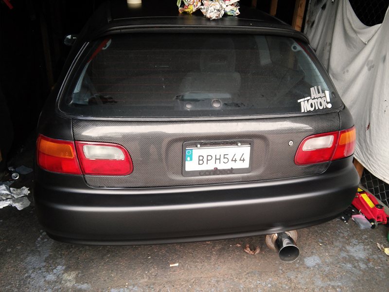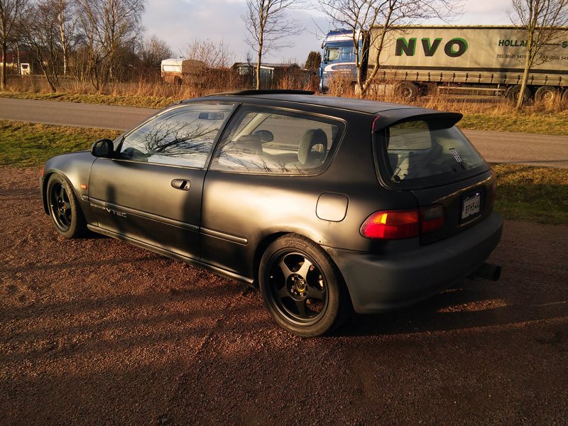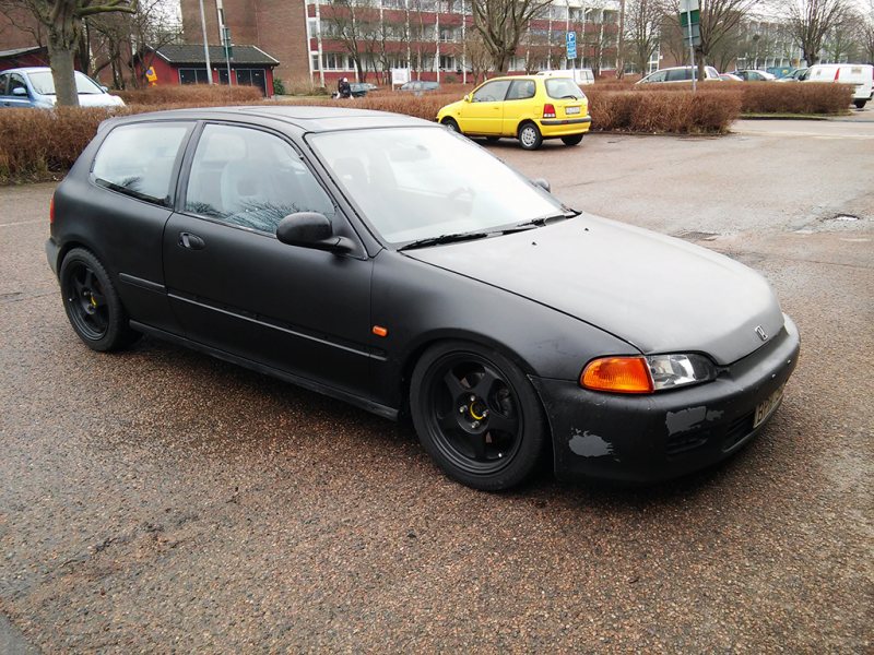 Tja, har en Honda civic EG5, som är lite "preppad". Har tröttnat på framhjulsdrift lite grann, och känner att jag vill prova på drifting. Karossen har rullat 22k~ motorn runt 13k~ Motor: B16A1 Y21 Växellåda - lite skrap i trean till fyran vid höga varv. Integra Type R kammar Integra Type R kolvar OBX 4-1 grenrör Valkuk kolfiber insugsrör 352cc spridare E85 Rostfritt 2,25" avgassystem hela vägen från katt och japsdämpare i slutet. P30 original styrbox, bör mappas på E85. Går lite halvdant på lägre varv. Chassi: MTS technik coilovers Alu LCA bak Camberstag bak Ställbara övre länkarmar fram. Alla bussningar i fram och bakvagn bytade. Rota slipstream 16x7" med Bridgestone RE002 205/45-16 5mm~ kvar på alla däck. slitzade skivor fram och bak. Goodridge stålomspunna bromsslangar fram. Allmänt: Skunk2 växel knopp Skunk2 och password jdm fender washers Skunk2 vtec solenoid cover dual bend shortshift AEM bredbandslambda Integra förarstol Svarta inredningen RRS moccaratt rensad från framstolar och bak. Kolfiberbaklucka "Usa" skylt bak Orangea blinkers Klarglas framlampor Antenn block-off Långa oem vingen Finns lite att göra vid på karossen, bakskärmar behöver lite kärlek. Annars är den rostfri. huven bör bytas då den egentligen är till en Sedan modell, så den är lite för lång. framskärmar har lite mindre bucklor.