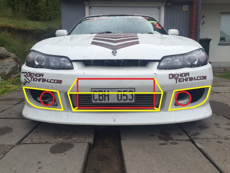 De röda är dit luften ska och det gula är hur luften ska styras/stängas ute. Om du dessutom fortsätter med en trumma mellan intercooler och vattenkylare så borde man kunna blocka intaget mellan lysena med för ännu mindre övertyck/lift i motorutrymmet och mer tryck på en framtida splitter...
