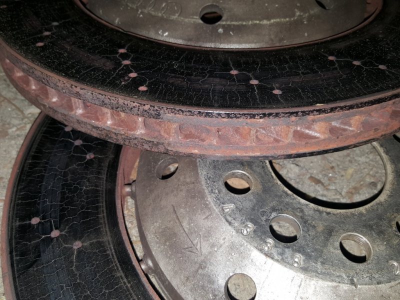 Det som är säkert med borrade bromskivor (om de är ventilerade) är att de spricker, oavsett om det är original kvalitetsskivor från porsche, audi, bmw, ferrari eller eftermarknadskivor. En bra tumregel för när det är dags att byta är när sprickorna börjar gå mellan hålen. Titta noga på bilden, det är feta sprickor som går mellan hålen och vidare...