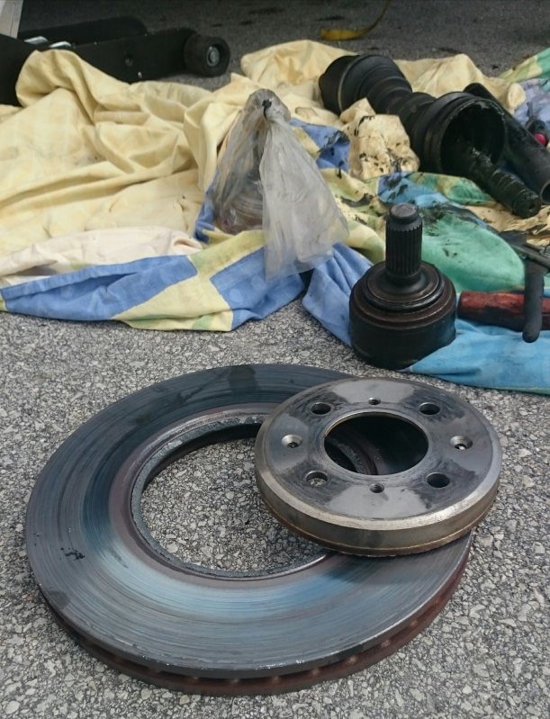 Hej Hade lite otur i förgår på Gotland Ring. Min högra bromsskiva sprack, släppte från navet och slog sönder drivknut och hjullager. När man ser på filmen så ser det inte så dramatiskt ut och det var det inte heller. Men hade det hänt efter långa rakan eller i hårnålen, så hade jag nog behövt köpa ny bil igen. ;-) Hjulet satt mycket löst, pgav drivknuten stora bult, som håller hjulet på plats, bröts av. - http://www.youtube.com/watch?v=Nwf1y Lyckades byta drivknuten på plats,med hjälp av "André U" här från Rejsa, spärrade kolven med en extra kloss och packrem för att kunna bromsa och haltade hem till stugan.