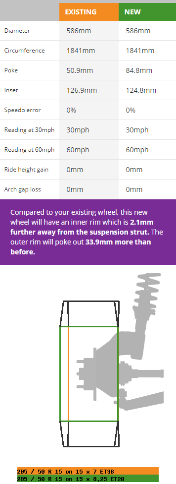 Hej! Har en Honda Civic Hatchback -92. Original 185/60-14 | 6" | ET35 Alt1 | 205/50-15 | 7" | ET38 | Kumho V70A Hard (r-däck) Alt2 | 205/50-15 | 8" | ET20 | Kumho V70A Hard (r-däck) Vad kommer vara fördelen med Alt1 mot alt2 och vice versa?
