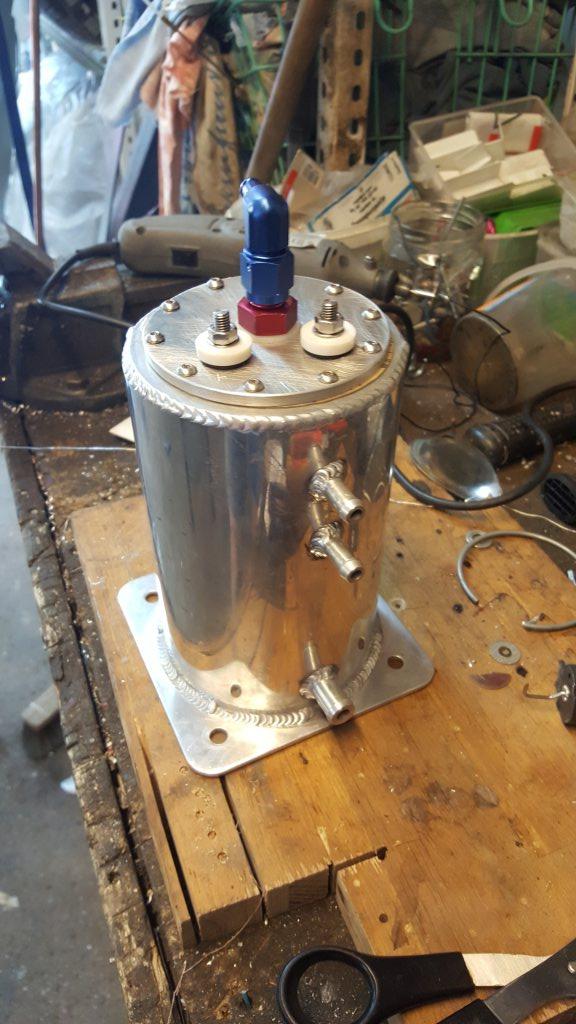 Då har jag fått tyst på bränslepumparna. Skaffade Biltemas in-tank-pump som Knotan tipsade om och så tog jag hål i toppen på catchtanken och fixade ett lock med genomföringar för bränsle och för ström till pumpen. Hade lite svårt att få det helt tätt men efter lite pyssel så lyckades det. Detta i kombination med ett par gummiupphängningar till förpumpen så är det nätt och jämt att man hör pumparna!