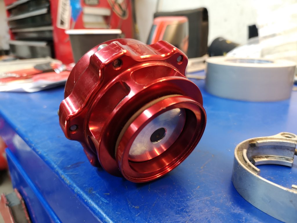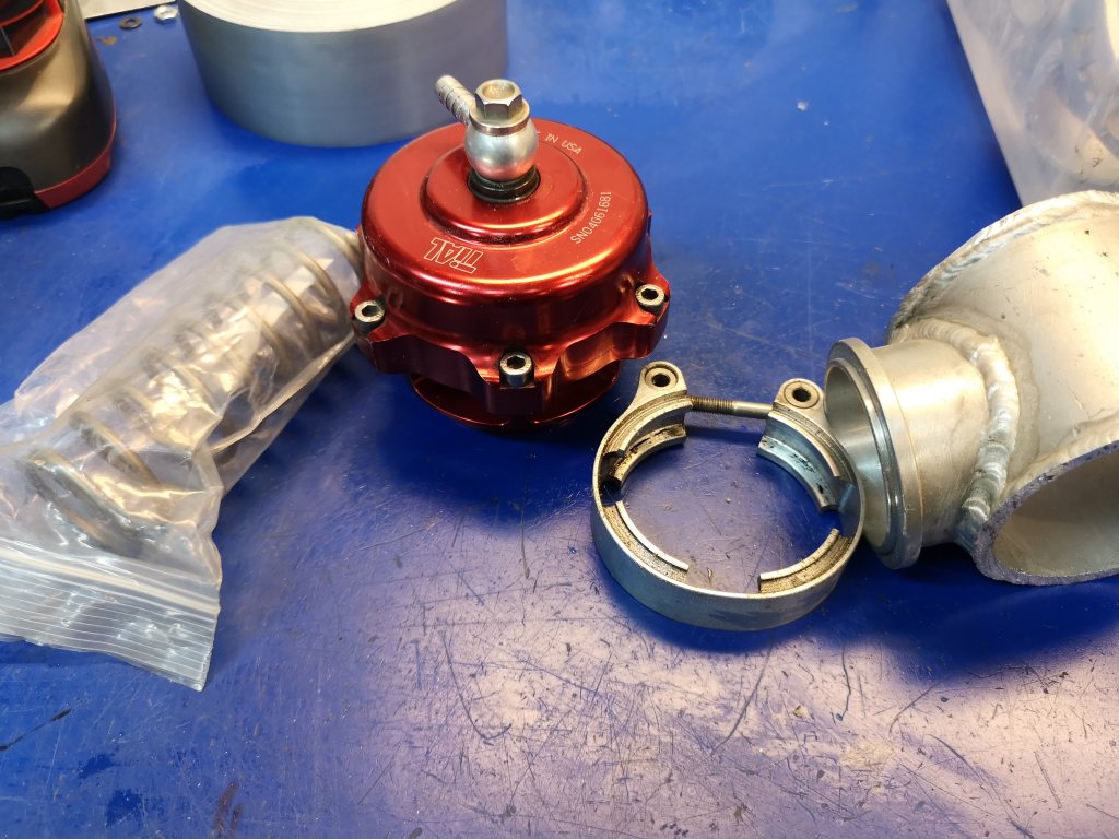 Tial 50 mm dumpventil. Med extra fjäder, vetsfläns (svetsad på en 3" rörbit alu) och v-bandsklämma. Nypris ca 2500. Pris 1100 kr.