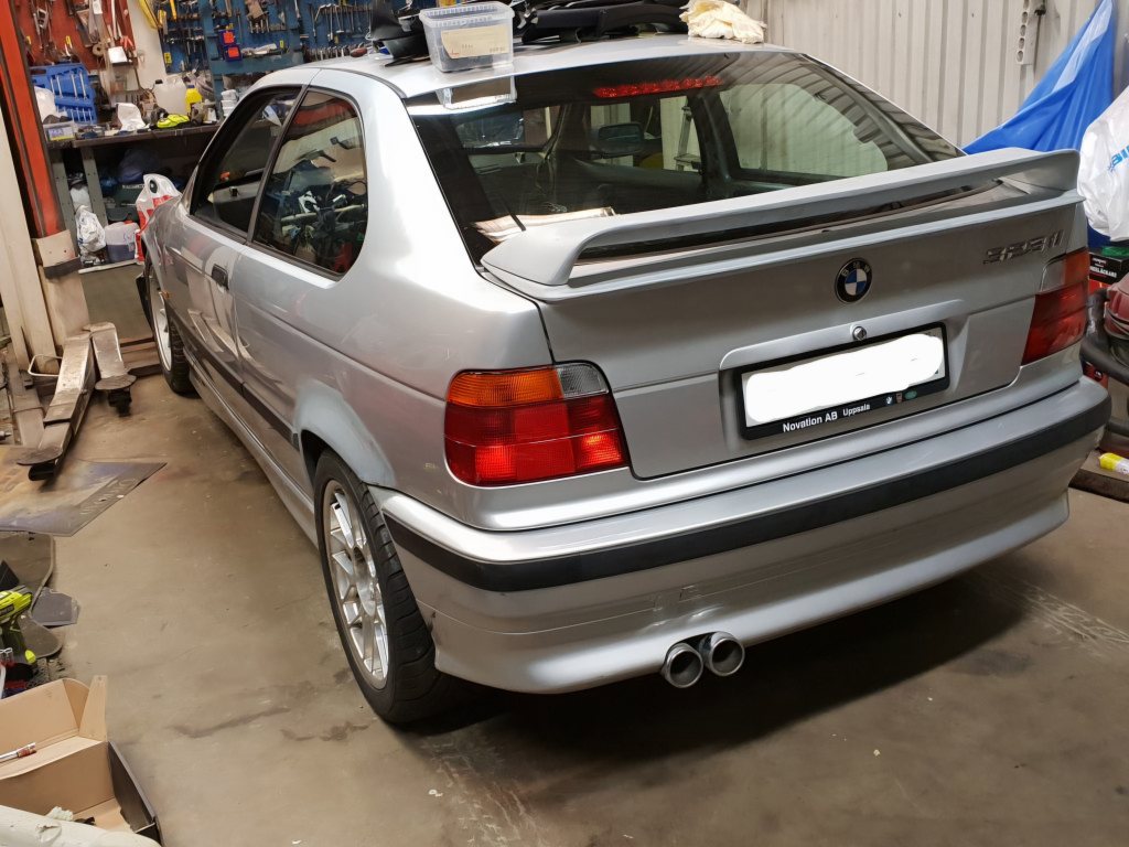 Målet. Ha skoj, och förhoppningsvis hålla jämna steg med min brors dyrare bil på bana 😉 Kortsiktig plan : M3 front. (Klart) M3 speglar. (Klart) Bromskylning. (Klart) M3 GT vinge. (Klart) Större lätta hjul. ( Klart Team Dynamics Prorace 17") Vita bakljus å blinkers. (Klart) Bur byggnation ( Klart) Bättre Förarstol och bälten. (Klart) Fixa de skadade skärmarna som tidigare ägare rullat å slipat rent å grundat. (Klart) Bygga värmesköld och matningmed kall luft till luftfilter. (Klart) Längre fram: Byta färg ? Större bromsar. Mer effekt. Lätta bilen mer ? Lamelldiff. Spec 2022. Motor : S50B30 M3 3,0. 286hk. BMW Grupp N oljestrypning i toppen. Aem Dryflow 3,5" luftfilter. Supersprint grenrör. Coatat. 3" avgas med SBF katalysator. Apple ljuddämpare. Mishimoto Aluminiumkyl. J-spec fläktkåpa. Spal 15,2" högeffekts Elfläkt. Setrab slimline oljekylare. Drivlina: M3 E36 5växlad ZF M3 3,0 svänghjul och tryckplatta. Sachs performance lamell. M3 /328 kardan. E30 lamelldiff 188mm 3.46 Bromsar: M3 3,0 Bromsservo. Z3M Huvudcylinder. K-sport 330mm flytande skivor och 8kolvsok Fram. Ebc RPX belägg fram. Porsche 996 ok bak, Z4 skivor och adaptrar från 300mm.de EBC orange belägg bak. Bromskylning fram 2,5" Chassie: D2 coilovers. Millway topplagringar. Superpro bussningar. X-brace från mrtuning. H&R krängningshämmare fram/bak. Polyuretan motor/ växellådskuddar. Interiör: 6punkts bur med demonterbara dörrströvor. Sparco Evo L / Evo 2 stolar. Takata 4 punktsbälten. Omp ratt. Nått shortshift spakställ. Kaross: M3 front. M3 speglar. M3GT / LTW replica vinge utan raisers. M-sport bakstöt. Rullade skärmar. Däck / hjul: Team dynamics Prorace 9x17 ET30 Kuhmo V70A 245/40R17 Igår var första dagen jag gjorde något med den efter inköp. Fick rensat ur all inredning inför burbygget.