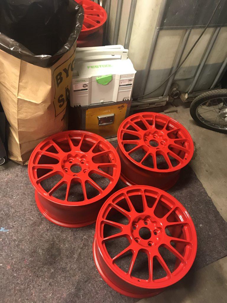Hmm var ett bra tag sedan man skrev något i tråden, men lite skit har hänt under tiden, tyckte svarta fälgar blev för tråkigt, så tog hjälp av en styling kunnig kompis, som gav förslag på hur bilen ska se ut framöver, så skickade fälgarna på lackering, blev Sosse röd kulör