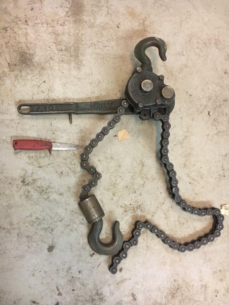 Spaklyftblock, 1500 kg (kniv på bild för storleksuppfattning). Hämtas i Göteborg. Pris: 300 kr
