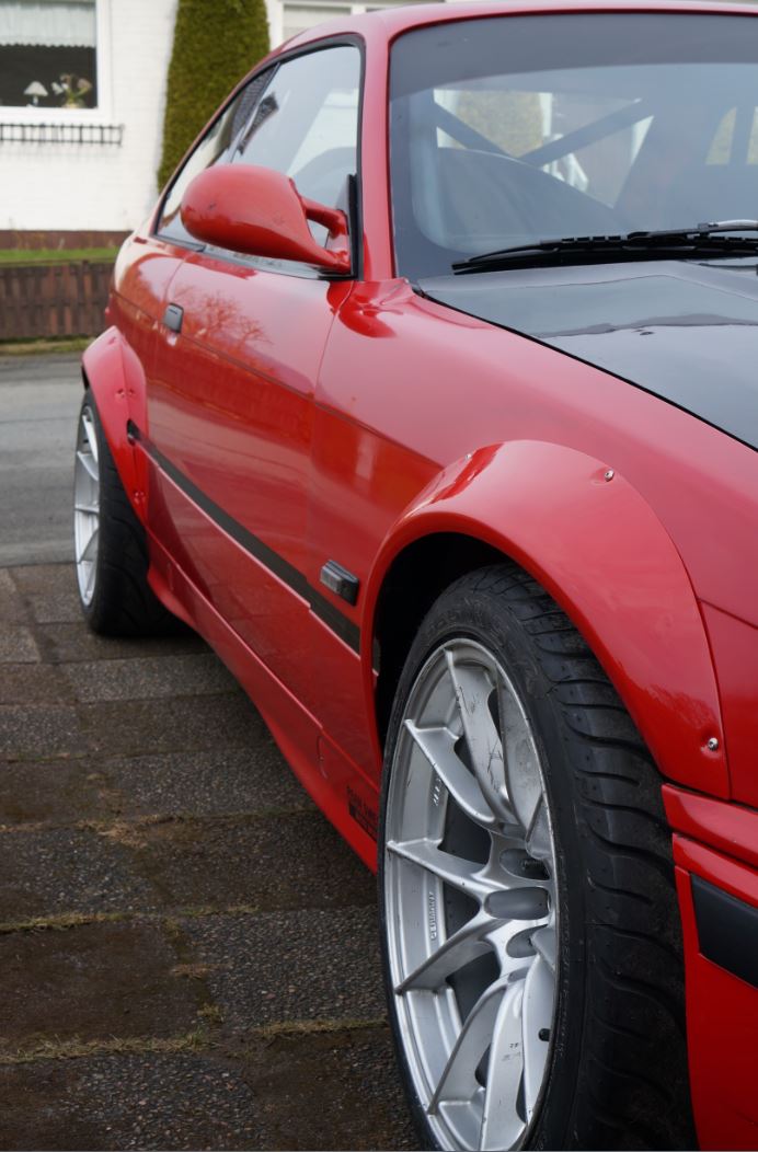 Kaross 318is -93, helt rostfri, urkapade dörrar och bagagelucka. Igenlagd taklucka, Komplett M-paket (sidokjolar nylackade men ej monterade) Marcus S har svetsat buren (tror det var efter något drifting reglemente men jag är osäker, kanske står i hans tråd) Sparco Evo stol, 6-p bälte. Nån mocca-ratt.. Fartfabrikens skärmbreddare och stolsunderrede. ACM GF-huv. Ej seriöst lackat tak efter igenläggningen av takluckan, samt förardörren är lite bulig och ful. Den ena framskärmen är inte fin heller då Marcus glömde huvlåset en gång Men GF-framskärmar kan följa med vid smidig affär. Rostfria och orörda dörrar kan också ingå om man vill det, dock i fel färg.