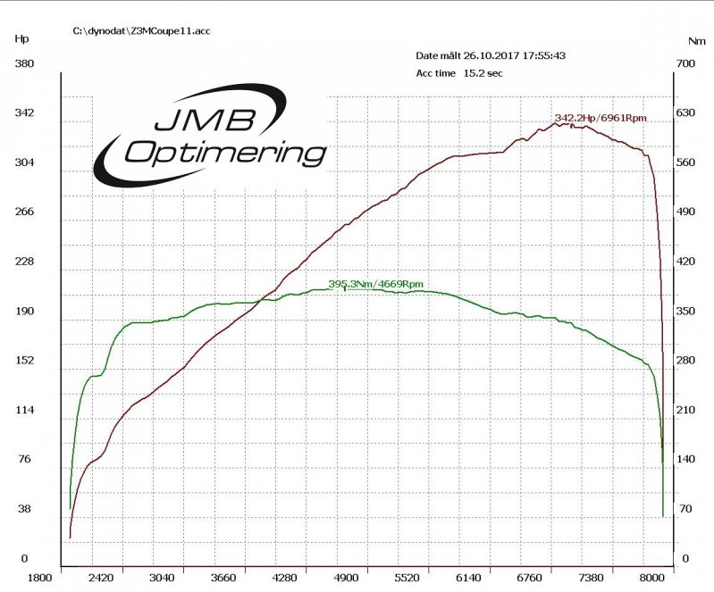 Bilens tråd finns här: https://rejsa.nu/forum/viewtopic.php En estorilblå BMW Z3M Coupe med s50b32 maskin säljes. Bilen är en före detta testbil från BMW, en så kallad TÜV Prüfung. På en massa utav inredningen sitter daterade oranga lappar ifrån BMWs utvecklingsavdelning. Bilen är inte reggad som en BMW M coupe utan efter ett namn i Tyskland. I svenska registreringsuppgifter står det under tilläggsinformation att blien är av "typ BMW Z3M Coupe", vilket är kanon att ha vid besiktningar då ingen kan säga vad för utrustning som sitter på en sådan bil. Bilen är fritt byggd för att prestera på bankörningar och time attack utan några reglement i tanken. Bilen har presterat 59.49 med mig vid ratten på Kinnekulle. Letar du efter en originalbil är det bättre att du tittar på något annat objekt. Till bilen finns dock det mesta i originalväg såsom komplett inredning, chassi mm Bilen reggades i tyskland okt 1999 och kom till Sverige maj 2000. Köptes i stort sätt original utav mig juli 2012. Bilen har rullat ca 8 500 mil och är besiktigad till 2019-09-30. Har säkert glömt en massa i beskrivningen, men läs igenom noga och återkom om något är oklart. Kaross Original kaross med en wiechers skruvade helbur som är påbyggd. Buren är för tillfället penselmålad svart då tanken var att ta ut den och lacka den "på riktigt" i vinter. Bilen är breddad 14 cm framtill genom att kolfiberhuven är breddad, original framskärmar och original stötfångare fram är påbyggt med glasfiber ca 7 cm per sida. De ombyggda delarna har finnish någonstans mellan original och race. APR vinge bak i kolfiber med vingställningar ifrån Fartfabriken. Bred splitter fram och en diffusor bak (mest for show). Bakre hjulhus är valsade. Alla asfaltsmattor är borttagna och kupen är målad i svart. Sparco skalstolar med Fartfabrikens underreden, OMP 6p bälten med FIA-plattor i karossen. Extra mätare för oljetryck, oljetemp samt vattentemp. Fartfabrikens växellänkage samt spak. En uppsättning LTW 17x9 fälgar med 255-40-17 R-däck. Chassi KW Clubsport chassi köpt och monterat 2015 vid 8 273 mil. Clubsport fjädrarna utbytta mot KW racefjädrar. KW topplagringar. Alla bussningar i fram- och bakvagn och diff är bytta mot alu eller delrin. Bakvagnen är justerbar med Millwaykit. H&R krängningshämmarkit fram och bak för Z3M coupe sitter på. Roll center kit fram. Bilen är corner weightad och hjulinställning för att vara snällt understyrd. Fjäderbensstag fram och bak Motor och drivlina Original S50b32 med följande modifieringar, kolfiberinsug med ingjuten LMM, Grp N mappad styrbox, uppdaterad vevhusventilation, mellanrör med racekattar ifrån Ferritta, DW200 bränslepump. Maskinen ger 342 hk i motorn, bänkpapper finns. Konditionen på maskin är bra, vid byte av bränslepump gjordes test av LMM, tändspolar och spridare samt leak down. Original växellåda (stålomspunnen kopplingsslang), koppling samt diff. Bromsar Säljes utan bromsar men har bromskylning fram, stålomspunna slangar. AP kit fram och bak finns som tillval. Servicehistorik Olja + filter vid 7730 mil Olja + filter vid 8273 mil / 1507 + vxllåda + diff Olja + filter vid 8380 / 1607 Kammar inställda, ventiler kontrollerade och två justerade 8508 mil / 1711 Olja + filter vid 8509 mil / 1806 Tändstift vid 8509 mil / 1806 Diffolja vid 8509 mil / 1806 KW clubsport monterat 8273 mil Hjulinställning 8200 mil Nya styrleder 8200 mil Nytt batteri 201506 Nya hjullager x2 8310 mil Nya bromsbelägg fram/bak 8334 mil Ny TPS 8395 mil / 1607 Ferrita mellanrör inkl racekattar 8394 mil / 1607 viktbesparing 7kg Ferrita 11.4 kg Oem 18.4 Bytt motorfäste förarsidan 8395 mil Ny o-ring oljestickerör 8395 mil 1607 Hjulinställning 8425 mil 1702 Nya o-ringar vanos solenoider insug/avgas s62b50 variant 8452 mil 1706 Nytt vanosfilter 8452 mil 1706 Nya remmar 8471 mil 1707 Renoverad vanos o-ringar och packboxar beisansystems 8496 mil 170813 Ny Bränslepump DW200 171027 Nya tändstift 8520 mil 1808 Pris Bil enligt beskrivning med tillhörande originaldelar - 250 000 SEK Tillval Finns delar i mängder OCH INGET SÄLJS LÖST INNAN BILEN ÄR SÅLD Komplett JAWS ESS kompressor kit omgjort för S50b32 med mappad styrbox - 40 000 SEK AP racing bromskit fram (ok, skivor, belägg), bak (ok, belägg) - 30 000 SEK Supersprint slutbukar ca 300 mil - 5 000 SEK Eisenmann race slutburkar ca 100 mil - 7 500 SEK Supersprint grenrör - 7 500 SEK Extra uppsättning LTW fälgar 17x9 (identiska med de som sitter på) utan däck - 6 000 SEK BBS RX 17x8 med regndäck - 4 000 SEK Aerofront replica i GF - 4 500 SEK Aerotrösklar replica i GF - 2 500 SEK PMa eller ring o7o1-812737