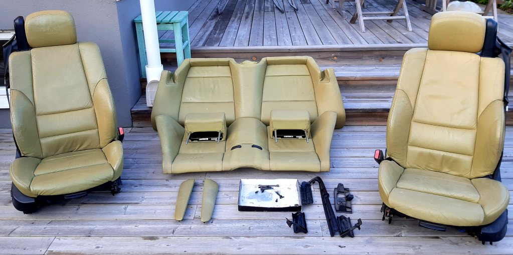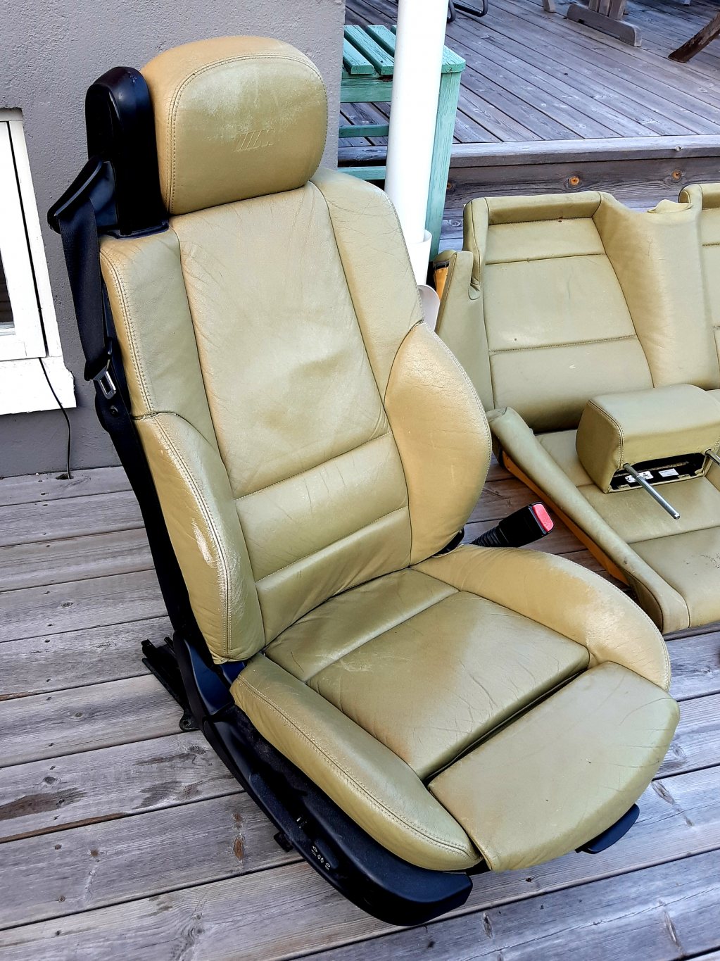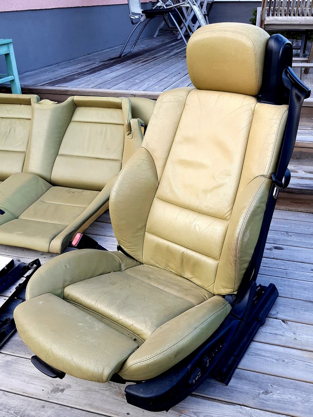 SÅLD! Hej! Säljer förarstol, passagerarstol och baksäte som suttit i en BMW M3 E46 cab 03. Färg är Kiwi Nappa. Ej funktionstestade, har av mig endast använts som heminredning. Skicket är okej. Allt som finns är det som syns på bilderna. Pris: Kom med ett förslag