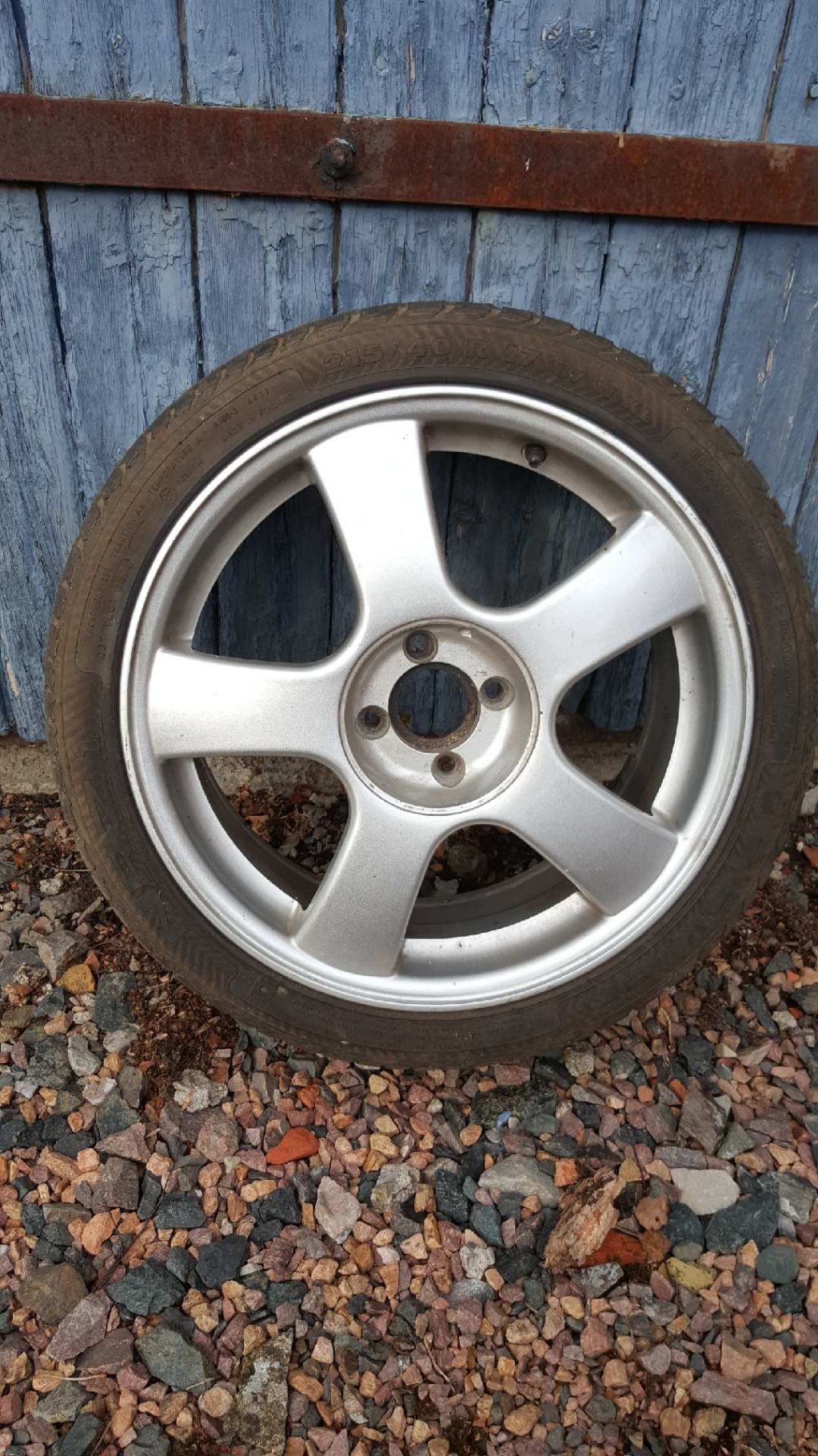 Fälgar 17 tum 4 x 100 Fyra st 7x17 et 22 med 57,1 mm centrumhål ( utbytbar centreringsring). Vikt: 6,9 kg. Nokia däck 215/40 med mycket mönster. Två av dom snedslitna. Torrsprickor finnes. Vissa kosmetiska skavanker finns på några av fälgarna. Finns utanför Lund, endast avhämtning efter ök. Pris: 1000 kr för allt vid snabb o smidig affär ( ligger i vägen).