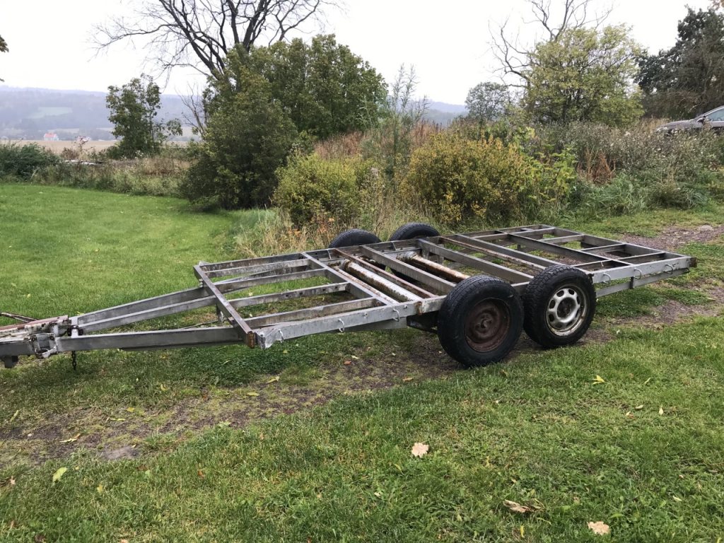 Rullande släpchassie med unika mått. Galvat ingen rost. behöver nya axlar, kulhandske, stödhjul el etc. Som syns på bilden är det ett rullande chassie. Det finns plats för ramper undertill. Nu det unika. I regbevis - Lastutrymmets längd....10360mm Bredd 1920mm Totalvikt 1600kg JCR 469 4000kr eller bud Ring 0760/528886 Nicklas Ericsson