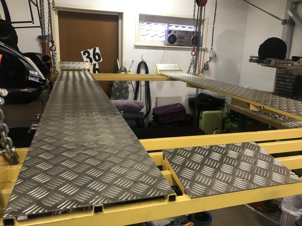 Den tar upp väldigt liten golvyta då den bara står på 4st 9x9cm träpelare i ytterhörnen. Lyften går att anpassa, bredd och höjd. Rampen är en svetsad rörkonstruktion med aluminium durkplåt Den har 4st 500kg lyftblock och man hissar upp och ner manuellt. Den står på 4st 9x9 cm träpelare direkt på garagegolvet. Stålkbalkarna består av 2st 'L-balkar' som är ihopbultade I mitt garage med en Super7 utan störtbåge upphissad, så kunde jag komma upp till ca 160 cm fri höjd under rampen. Då kan man ha en annan bil under utan problem. Jag kunde lyfta upp-ner min gamla Super7 själv med att hissa-sänka två lyftblock åt gången en liten bit, fram...och sen baktill etc. Hela operationen tog inte mer än 15 minuter från upphissad tills bilen var redo för en tur. Mått ramp: Bredd 157 cm Längd 270 cm Höjd 7cm (från garagegolv till rampgolv) Mått lyftställning: Höjd 260 cm (går att sänka ca 10cm enkelt genom korta pelarna, eller sänka mer genom att bygga om x-stagen) Längd c-c lyftpunkter 232 cm Bredd 390 cm (går att minska bredd genom att korta lyftbalkarna) PRIS: 5000 Kr Hämtas i Brämhult Ring 070 676 9768 om du har frågor eller vill köpa