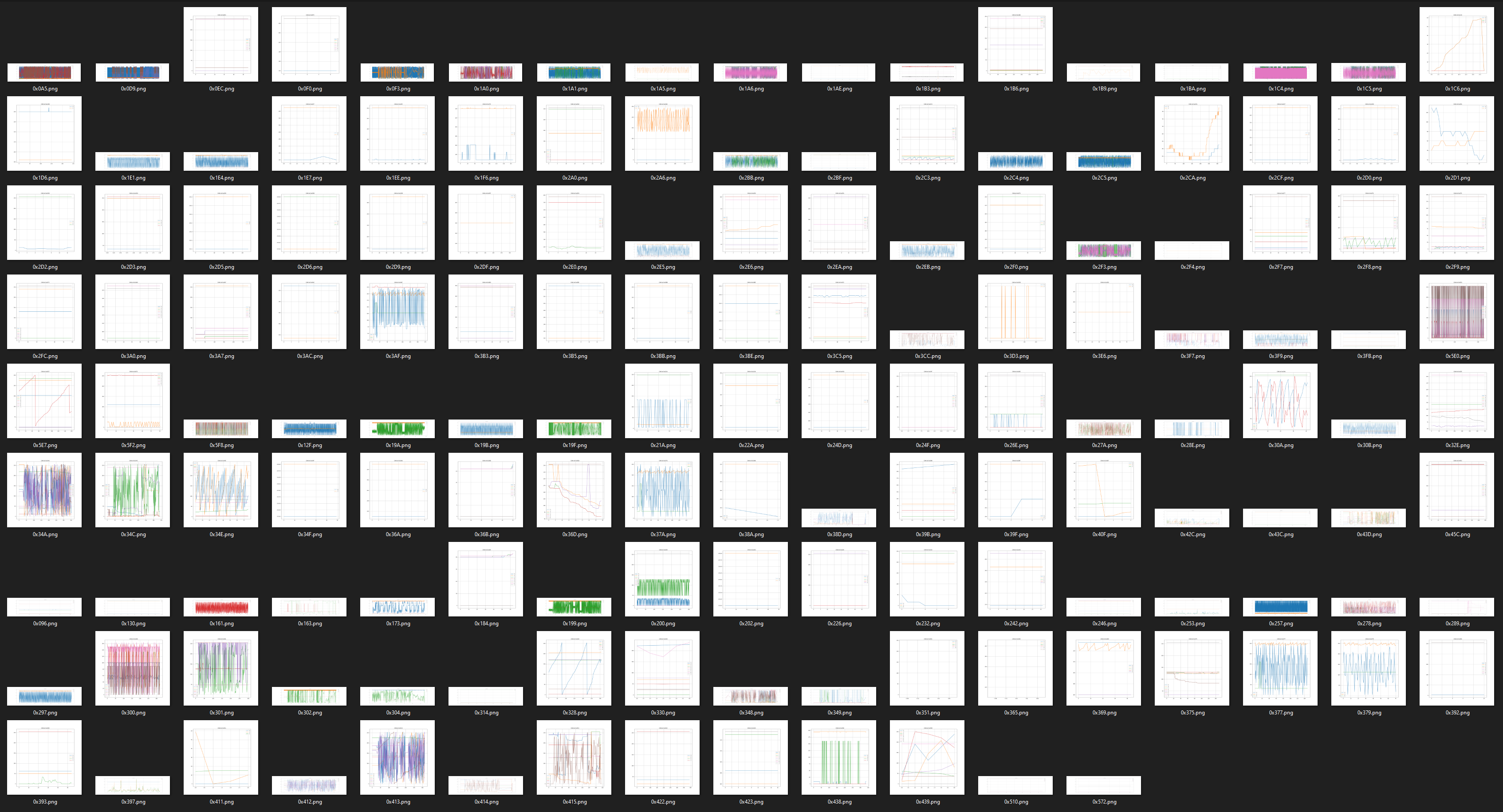 Gjort ett litet pythonscript som tar en komplett loggfil från endera av de olika canbusarna, splittar ut logfiler per varje can ID och till sist skapar en bildfil med data över tid för varje can id. Vissa id skickas med hög frekvens, andra väldigt sällan, så vissa grafer är med få glesa datapunkter och andra mer än välfyllda.
