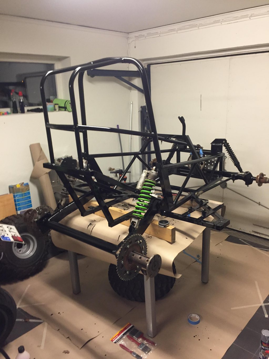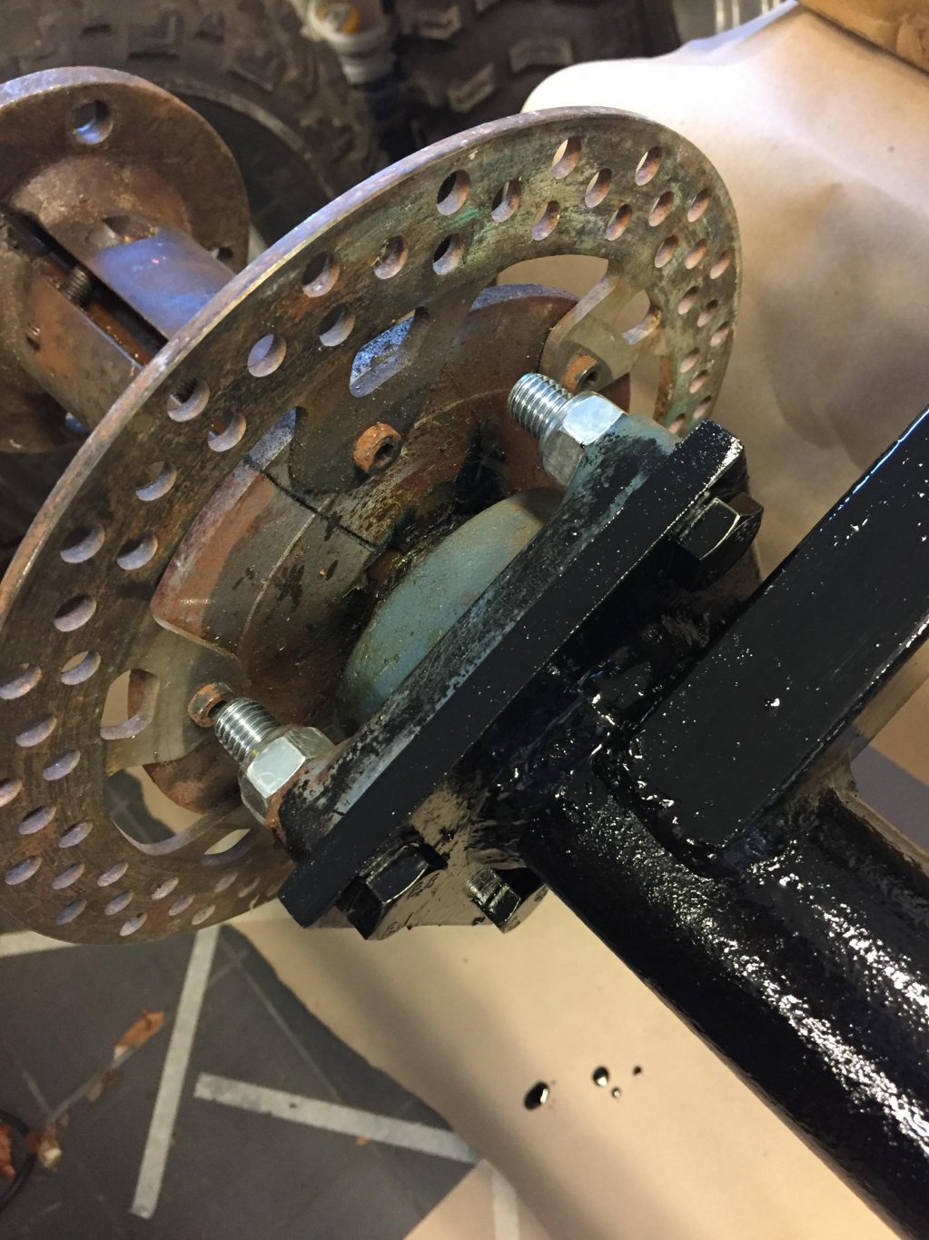 Hej! Fick hem chassit i lördags em och har tillbringat helgen med att slipa och måla, se bild 1 =) Jag har två frågor som jag undrar om någon kan hjälpa mig med? Vä bak längst ut på bakaxeln så sitter det en bult men inte på Hö bak, ska det vara så, är den kanske "fäst" i höger bak och sedan bultad i Vä bak? Se bild 2 och 3. Nästa fråga, hur får jag tag på ett bromsok som passar enligt bild, ca 10 cm mellan bulthålen och uppskattningsvis 5-6 cm till själva skivan, se bild 4. Tänkte bygga ett eget pedalställ, fick lite inspiration från Youtube, kan man använda ett vajerstyrt (mekaniskt) ok och vart hittar man isf ett sånt? Stort tack på förhand! Bästa hälsningar Stefan