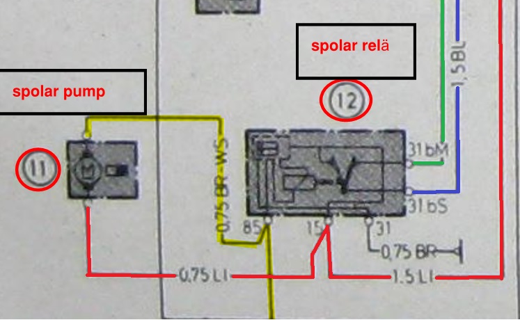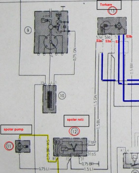 Spolpumpen får sin ström annanstans ifrån, samma ström drar det relät nr 12 på,pinn85. Minus styr , troligen ett tidrelä som drar torkarna typ 10 sek vid spolning.