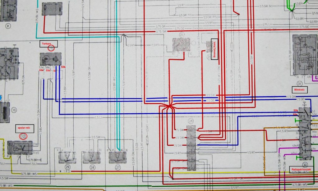 Fyllt i lite bättre hur jag tolkar att linjerna är ritade med. De två röda, en av dessa går till samma säkring som som ger +12v till pol 53a på spaken, den fortsätter från "gren ringen" med streckad till 53a på torkarmotorn, samt bort till signalhornet.