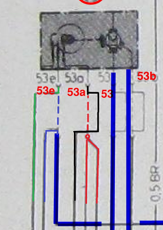 53a har konstant 12v. Så när spaken slås av hålls kontakt genom motorn i 53a (53 samt 53b för låg/hög fart annars). För att få stopp på motorn kortsluter den internt via 53e så motorn stannar av samma princip som en generator.