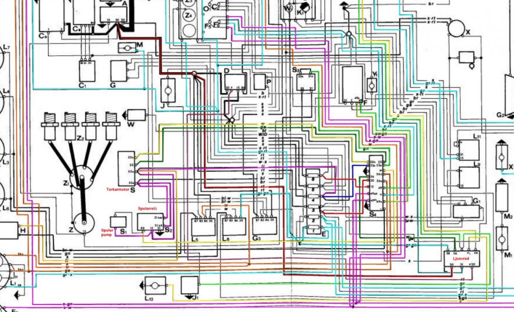 Men det skulle också gå läsa som att 53e går till 31bS på spolarrelät, och från de relät går 31bM till 53e på motorn. Spolarrelät jordas genom "w" på spaken som är knappen för spolarna.