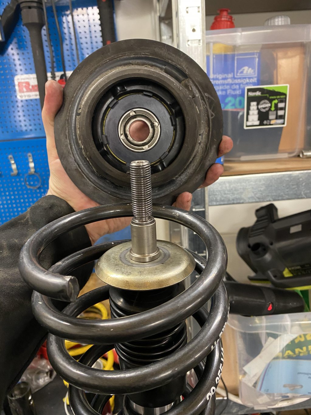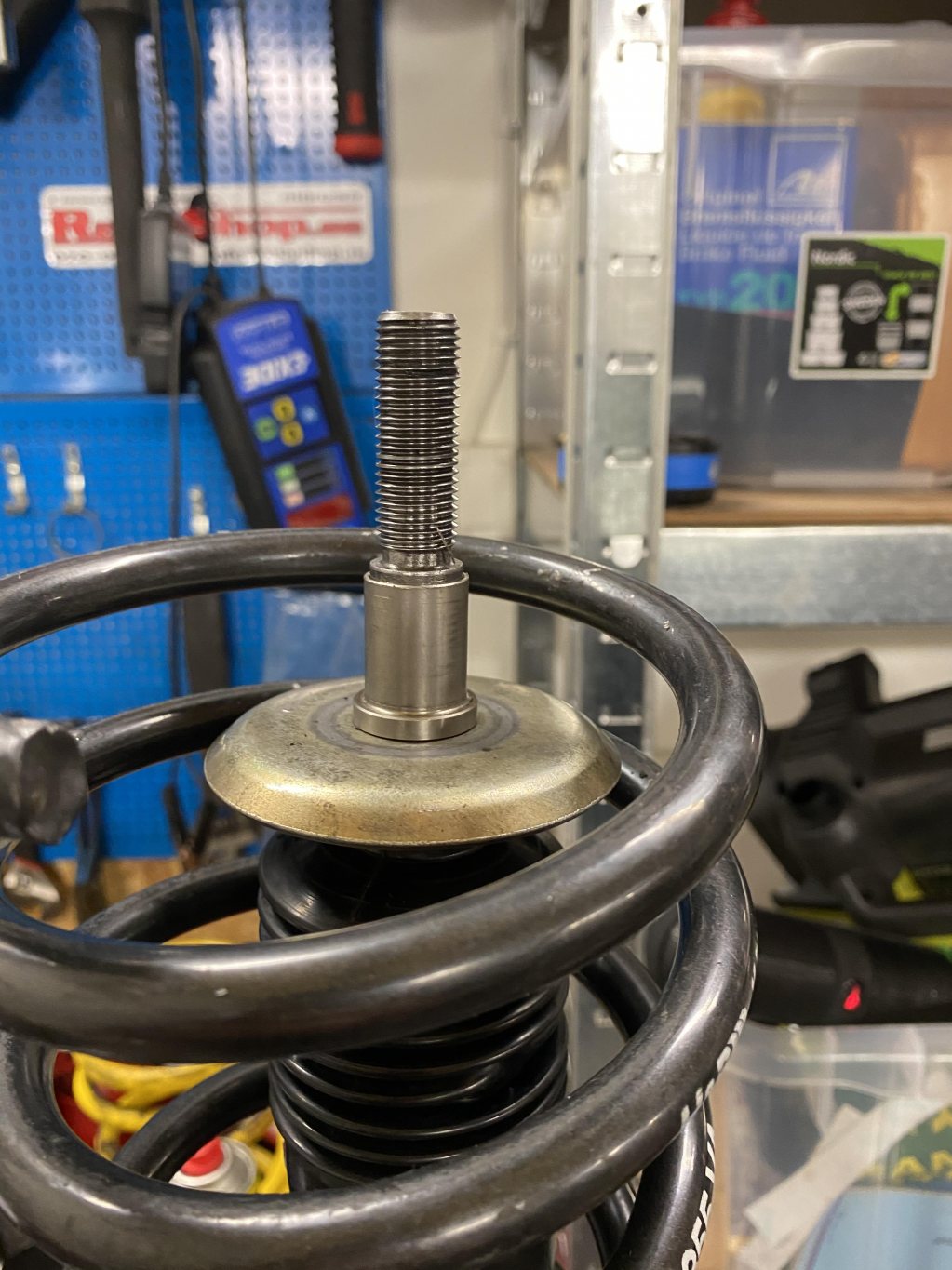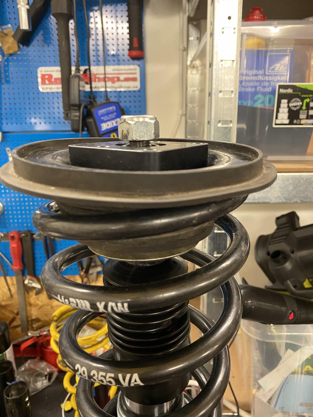 Sen att kolvstången sticker upp, ja plattorna är så låga jämfört med original. Bilen kommer bli superlåg, finns mellanlägg/ spacers man kan lägga imellan topplagringen och kaross.