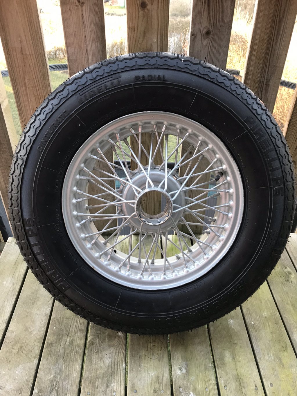 1 st ekerhjul enligt bilder , okänd härkomst . Ser väldigt snyggt och prydligt ut men det saknas av någon anledning enstaka ekrar. Troligen mest lämpligt som dekoration eller på reservhjulstället. Finns i Furulund. 400:-