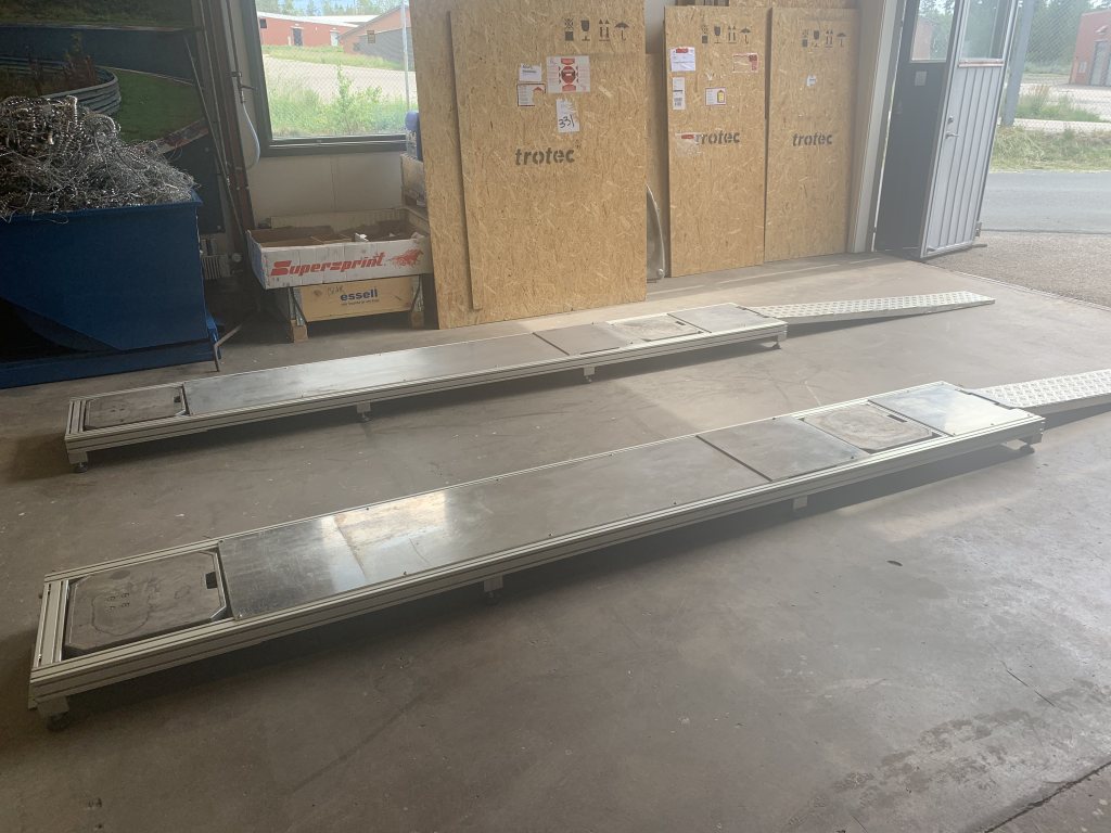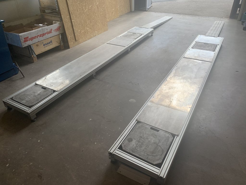 Cornerweightramp/ställning i kraftig aluminium. Byggda av mig. Krafiga 60mm aluprofiler. Riktigt stabil med 8 ställbara gummifötter per sida. Passar vanliga cornerweight vågar. Går att göra ännu högre med 100mm distanser (ej på bild) Då kan man ligga under och göra justeringar och byta olja med mera. Bilen går att rulla av och på vågarna utan att starta bilen. OBS! Ramperna på bilden som man kör upp på ingår inte då dom är till vår biltrailer. Längd 3600mm, Bredd 520mm, Höjd 170-300mm. Ställbar hjulbas cirka 2300-2660mm. Kan byggas om till något längre men passar ej Maybach eller liknande bilar. ;