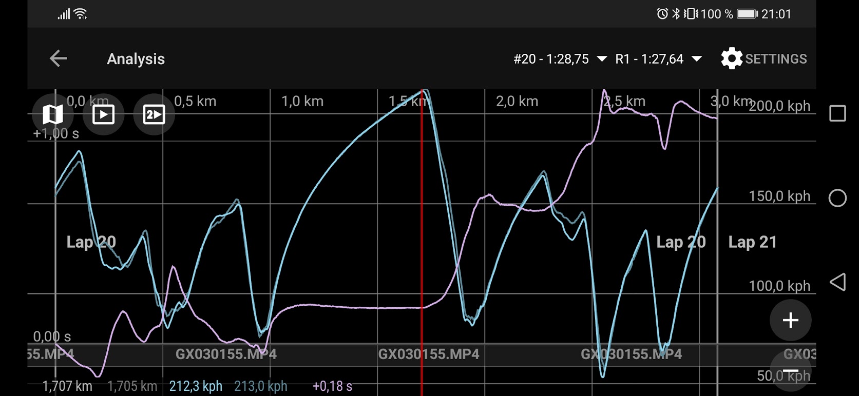 Bästa tid för dan (med Cup2 denna dag) blev 1.28.7 vilket är ca en sekund långsammare än bästa tid förra året på TrofeoR. I videon så är röd/gröna diffarna i bild mot hur varvet på TrofeoR var. Intressant att se att jag kör lite annorlunda, kände inte att jag riktigt litade på greppet fram, bak däremot absolut. Understyr ordentligt efter snabba knixen mellan Paris o chikanen tex. Tacka vet jag TrofeoR
