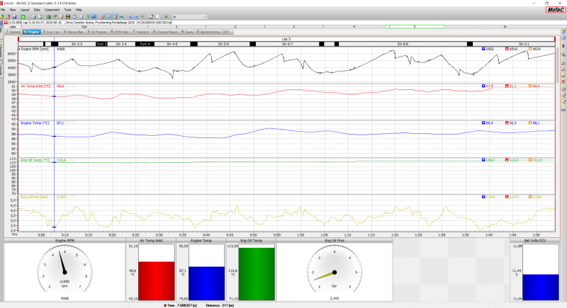 Jag har programmerat min Race Technology Dash4, så att den larmar genom att tända all lysdioderna rött om jag ligger under 3,0 bar i oljetryck över 1800rpm. Då täcker den all körning på bana, men i depån på tomgång efter körning så larmar den inte när jag ligger på ca 1,2 bar.