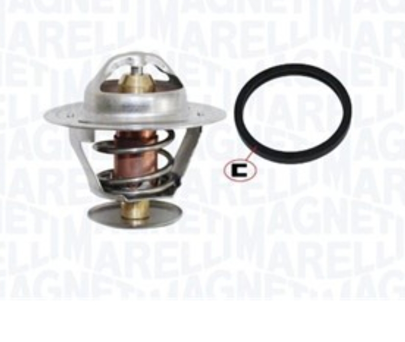 En ganska vanlig termostat, där vanligen den större skivan i mitten öppnar flödet mot kylaren, kragen runt denna är strypningen.
