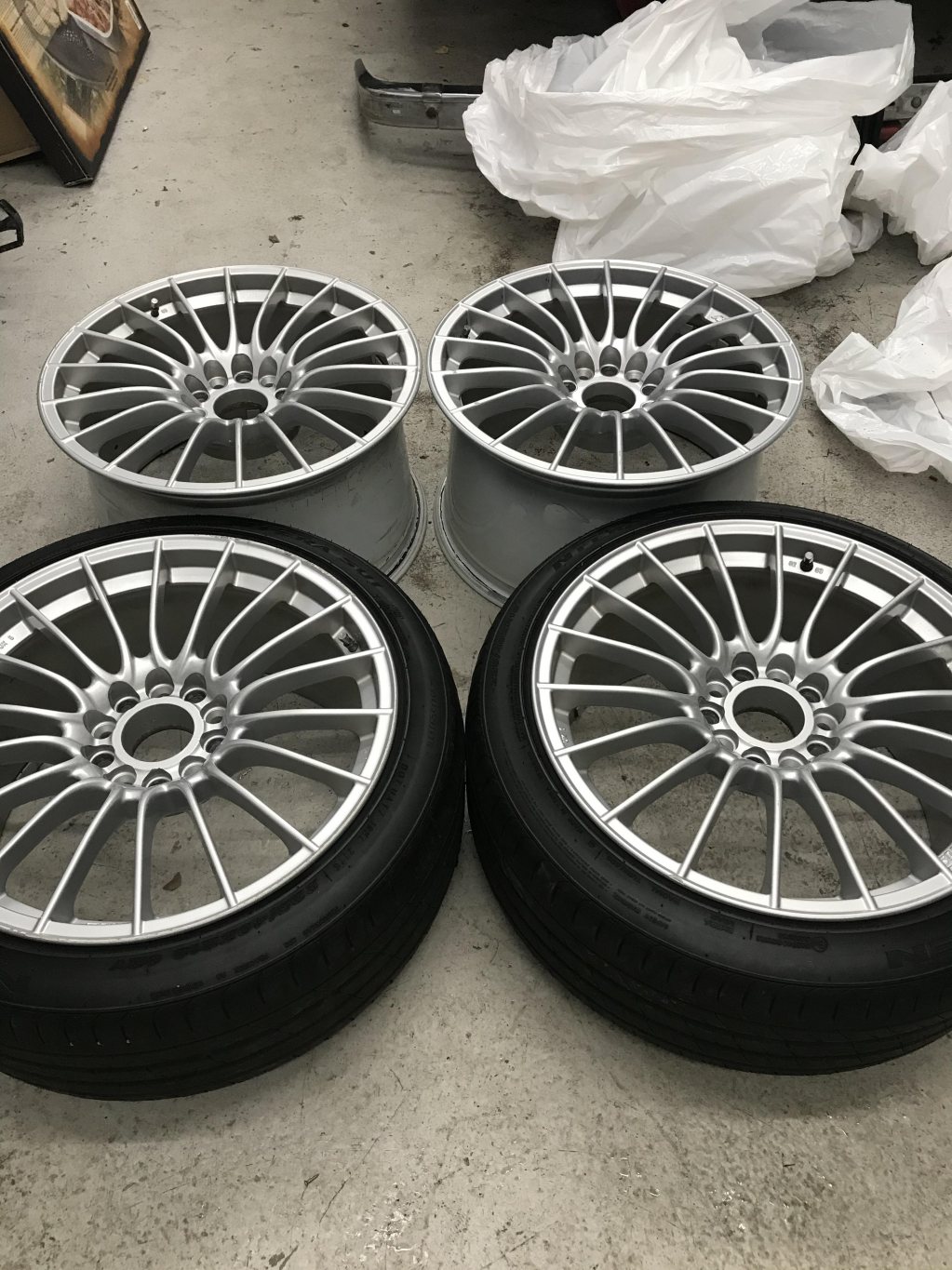Vet egentligen inte mycket om dessa. Köptes, men endast legat i garaget utan att användas. Ser fina ut även på insidan utav tunnan. Kan inte vara använda många mil. Ytligt kantskrap finns på en framfälg och en bakfälg.. Väldigt lätta fälgar som är perfekta för bankörning. INFO från gamla säljarens annons: Bultcirkel: 5x120 & 5x114,3 Nav: 72,6 Framfälgar: 18x9 et25 Däck: Nexen 225/40 4mm. Bakfälgar: 18x10 et28 Utan däck. PRIS: 5500kr