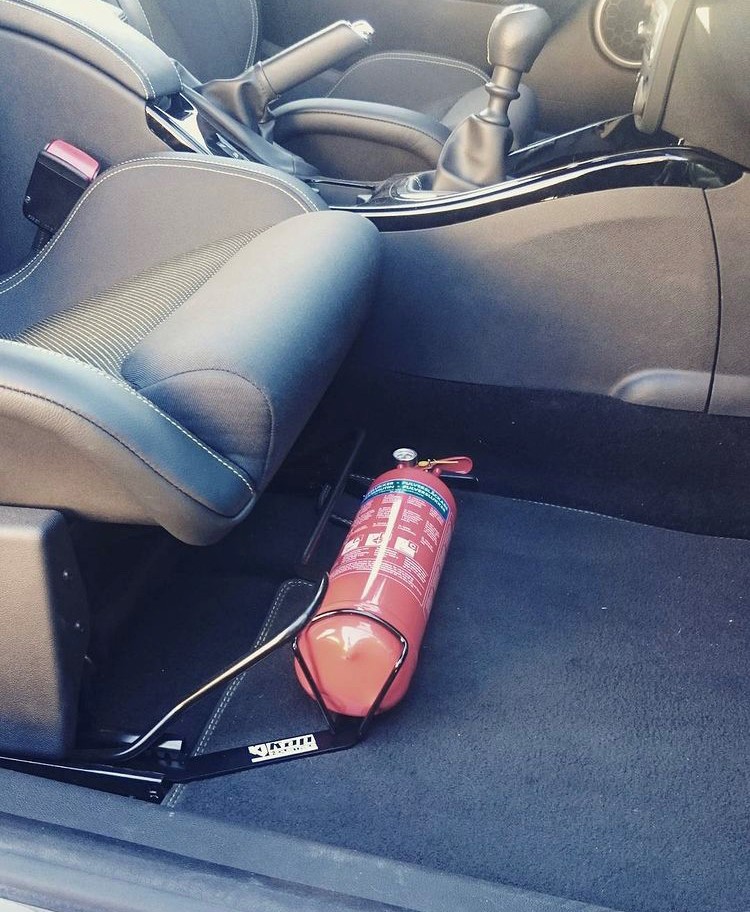 Brandsläckarfäste från Kap Industries passande Renault Megane RS 09-16 med Recaro skalstolar. Använder stolens främre infästningar så ingen extra håltagning är nödvändig.