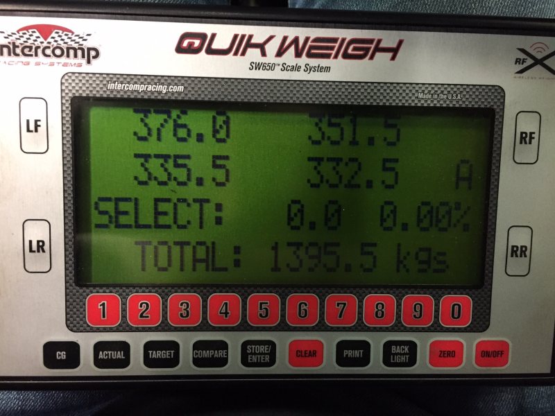 Vet faktiskt inte. Daniel kommer få väga den i samband med hjulinställning innan det bär iväg till ringen i höst. Sist jag vägde stannade nålen på 1350 utan förare med full tank. Men sedan dess har ett antal saker plockats bort. Har också köpt ett litet modernt batteri som väger en bråkdel jämfört med ett ordinarie. Men ändå, kan inte handla om mer än 20-30 kg tutti. Man skulle ju vilja hitta 100kg.