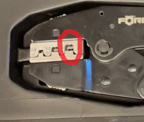 Jag använder Biltemas 71-656 och den gör snygga crimpningar Kom på en felpressning som var gjord på en hoj, de hade använt tången fel. De glömde att stoppa kabelskon i rätt hål, de borde ha använt de som ser ut som det rödmarkerade.