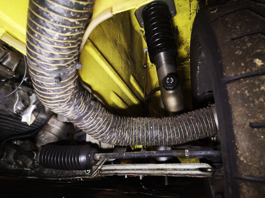 Förarplats bakflyttad med nytt pedalställ med bromsvåg. Ställbara dämpare från Leda med coilovers bak. Dropstops fram och hål för att kunna snabbskifta bakre torsionsstavar.