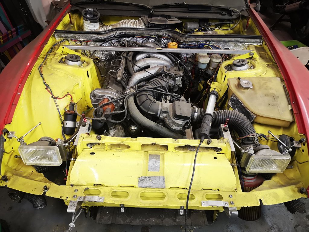 Det sitter idag en original 2,5l porsche 944 motor i som är ihopskruvad av 2 andra motorer. Ej uppstartad efter byggnation. Antagligen behövs bara svänghjulssensor justeras in. Även lätt att montera in annan valfri modernare motor som passar in i det reglemente man vill köra.