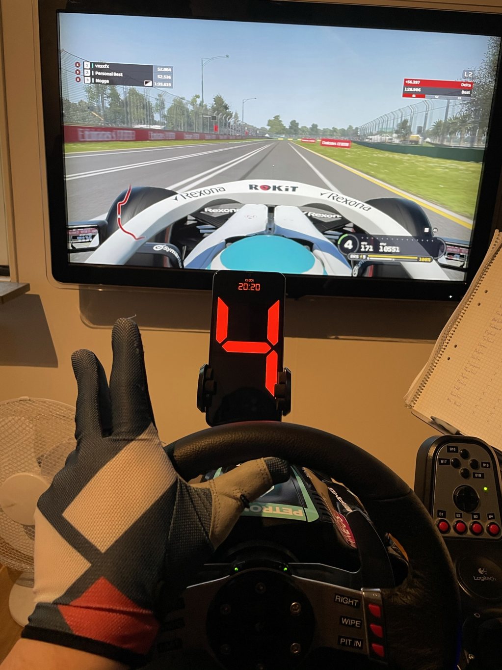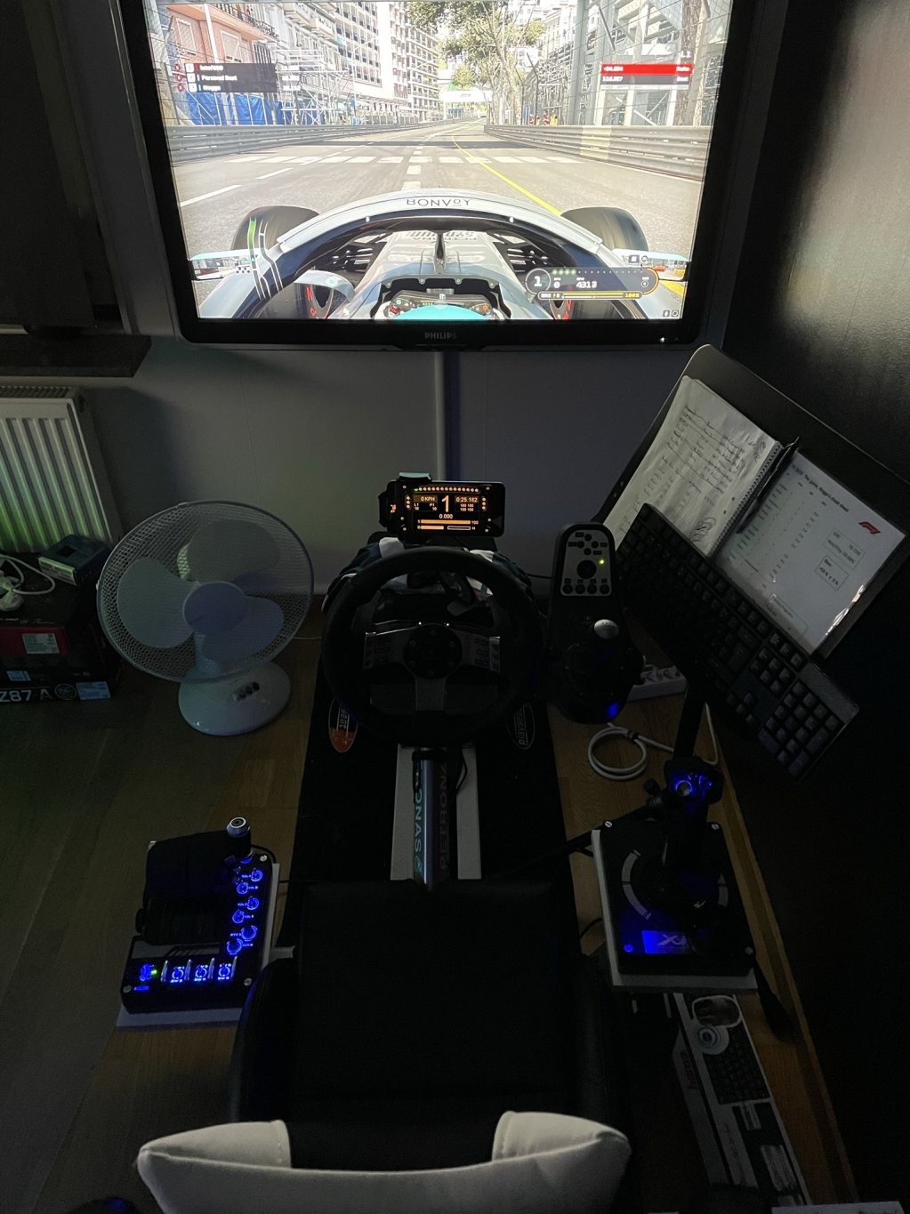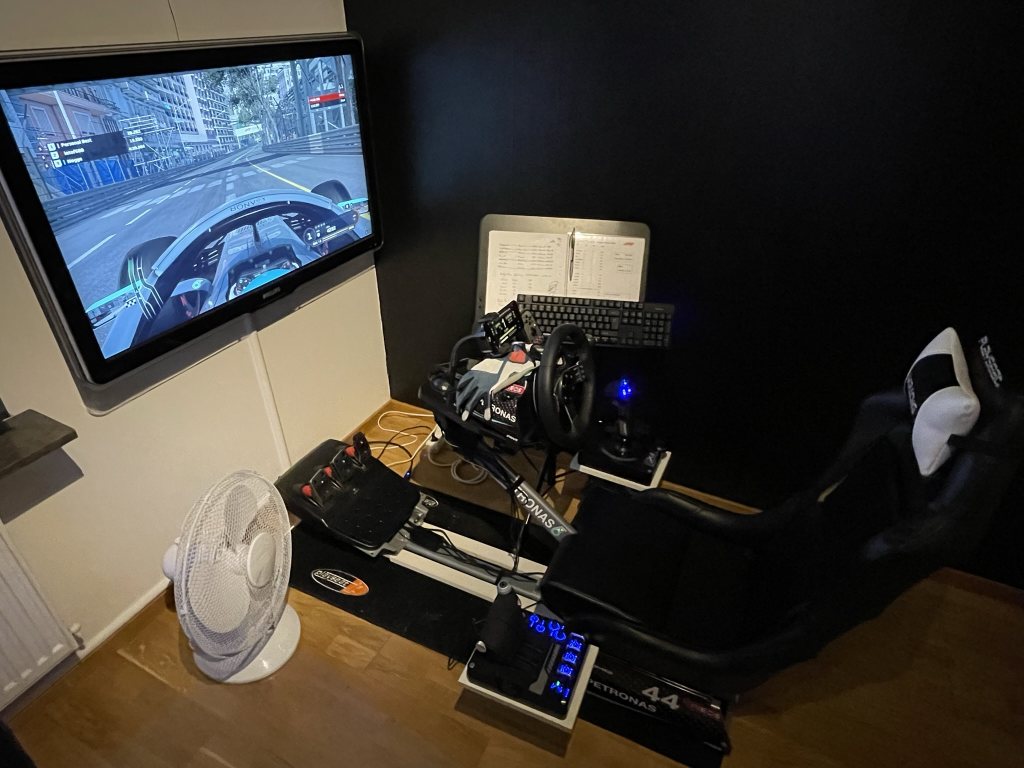 Passar nu vidare min trotjänare till någon som vill börja med simracing eller uppgradera till en mer komplett rigg. Paketet innehåller en Playseat Revolution med i princip alla tillbehör som går att få, seatslider, märkesbroderad matta samt tre(!) växelspakshållare. Alla växelspakshållare har jag använt för att även kunna flyga flygspel med joystick och gasreglage. Spel så som Microsoft Flightsimulator, DCS eller Elite: Dangerous funkar jättebra i denna rigg utöver bilspel eller bilsimulatorer. OBS joystick och gasreglage ingår inte. Ratten är en Logitech G27 som har fått i huvudsak två modifieringar. Den ena är en bromspedal från AXC för att få en stummare pedal som skall efterlikna Load Cell-pedaler. Detta ger en mycket bättre känsla i bromspedalen. Jag har också 3D-printat en växelpaddelmodifikation så man får magnetiska växlingspaddlar som ger mycket bättre taktil känsla. Länk till bromspedalen för mer ingående information om den: https://www.axc-sim.com/product/brak Som ni ser på bilderna är riggen dekaltrimmad med Mercedes F1 2021 livery, detta går att ta bort om man till exempel skulle vara ett Red Bull-fan ;-) En enkel mobilhållare följer med också som jag använt som digital instrumentbräda i racingspelen. En smått-och-gott-låda följer med med diverse tillbehör som blivit över efter alla modifieringar. Som ni ser är det mycket jobb och kärlek nerlagt på denna rigg för att kunna köra både bil och flygsimulator och jag är mycket nöjd över helheten som blivit. Vid snabb och smidig affär kan 55" med väggfäste ingå. Nypriset ligger på strax över 8000 med allt inräknat (exkl TV och väggfäste). Det enda som behövs för att komma igång med detta är en dator med spelen du vill köra. Skickas inte, går att få in i större kombi. Finns i Stockholm. Kan transporteras mellan Sthlm och Växjö i slutet av v13, men då får jag nog inte med mig TV:n. Fläkten, notstället, trådlös mus/tangentbord samt huvudkudden ingår inte. Pris: 5 000 Länk till Blocketannons: https://www.blocket.se/annons/stockh