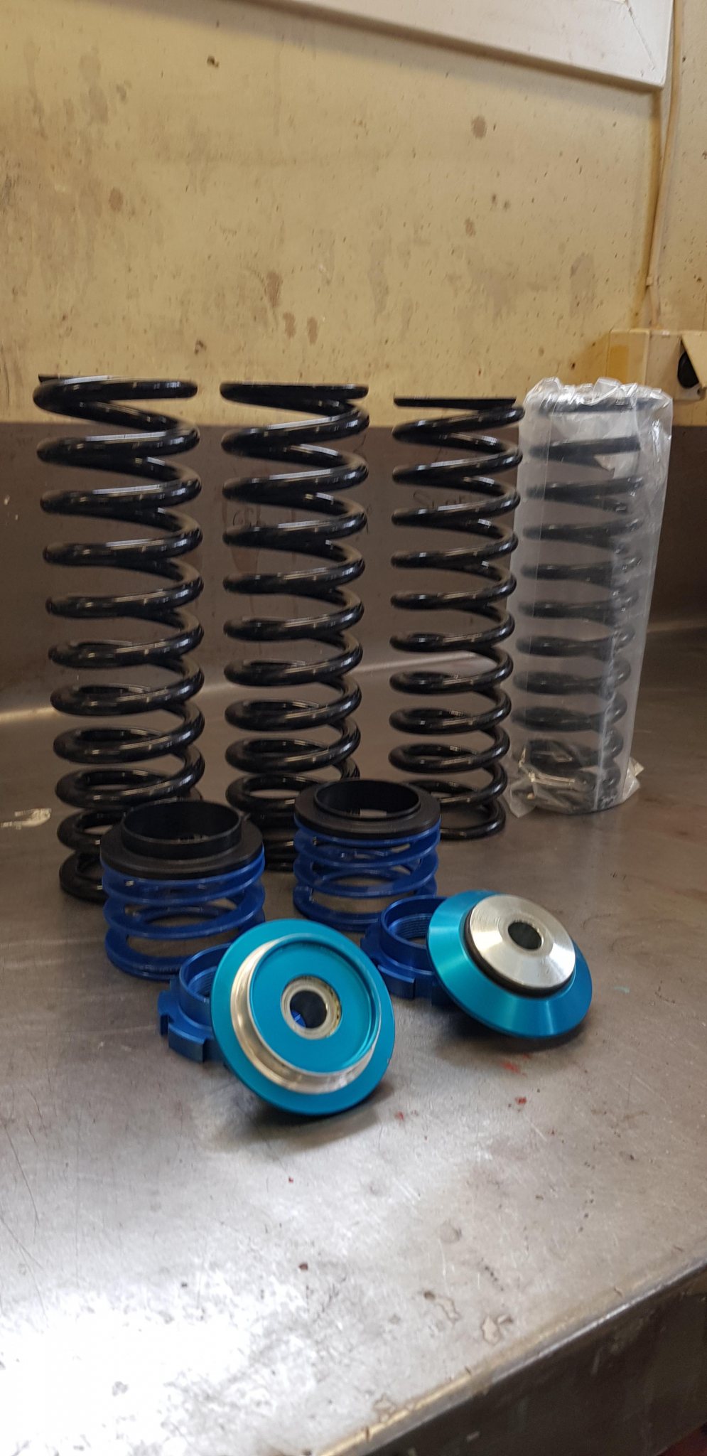 Fjädrar 2 1/4" 57mm innerdia 10,5" långa 2 st 180 lbs 2 st 300 lbs Pris 300:- st Hjälpfjäder 50 mm långa 350:- st Styrning till hjälp fjäder 90:- st Fjädersäte M52x1.5 120:- st Nållagrat fjädersäte (Sellholm) 340:- st Allt är i princip nyskick Uffe Melander 070 679 10 51
