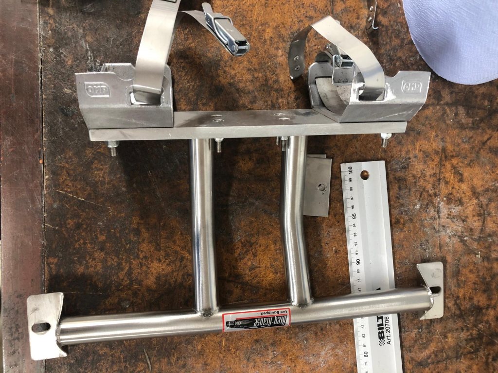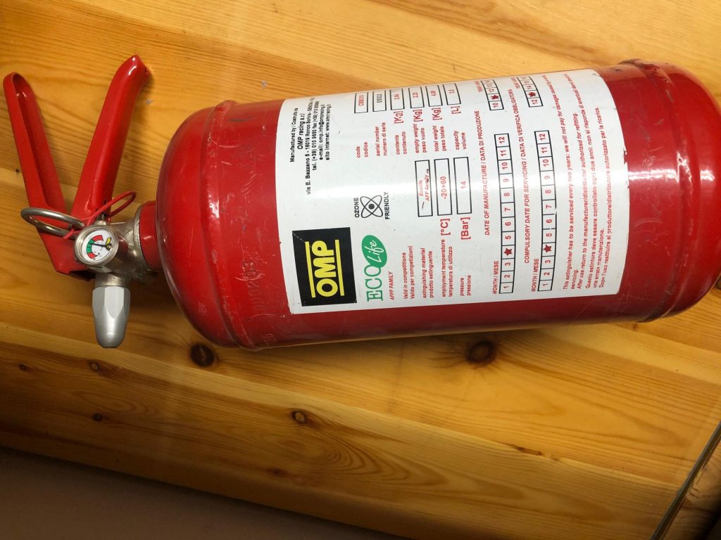 Har en skumbrandsläckare från OMP med utgånget datum men som fortfarande visar grönt. Med denna säljer jag ett fäste som skruvas i stolskenan framför passagerarsätet så att släckaren följer med stolen fram och tillbaka