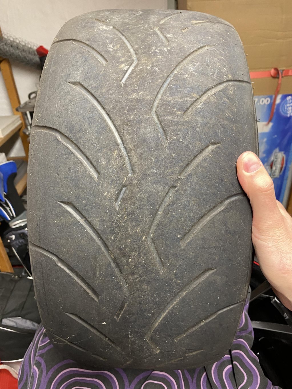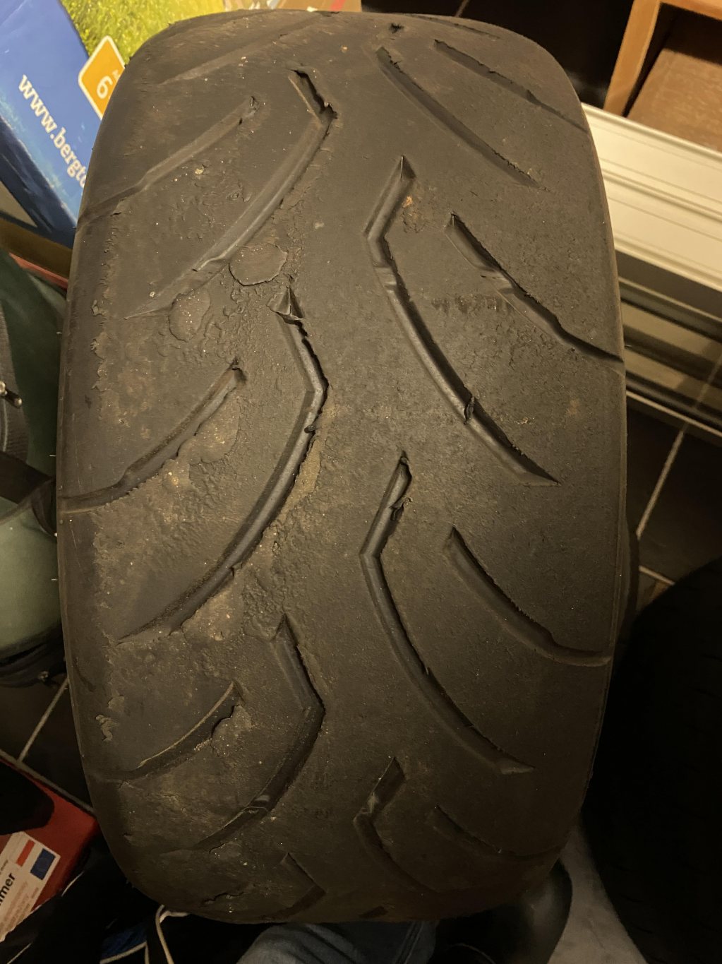 Ganska slitna däck, kanske tål ett pass eller två på banan.