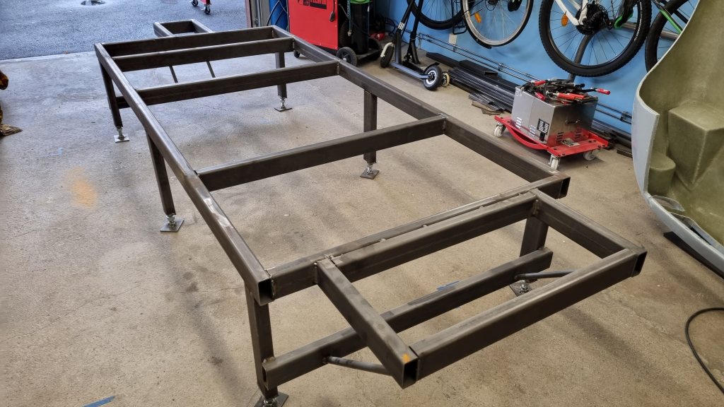 Nu har byggbordet gjort sitt och kanske kan komma till nytta för någon annan om intresse finns. Det är uppbyggt av 80x40x4 mm profiler med mått enligt bifogad ritning och har justerbara fötter för att kunna ställas i våg. Det har fungerat alldeles utmärkt till att svetsa ihop mitt GT40 chassie och bör fungera bra som bas till div. andra byggen med efter viss modifiering. Enbart materialpriset ligger idag på ca 4 800 - 5 200 kr exkl. spill och svetsning. Vikt ca 135 kg. Prisidé: SÅLT kr Bordet finns strax söder om Göteborg. Skickas ej.
