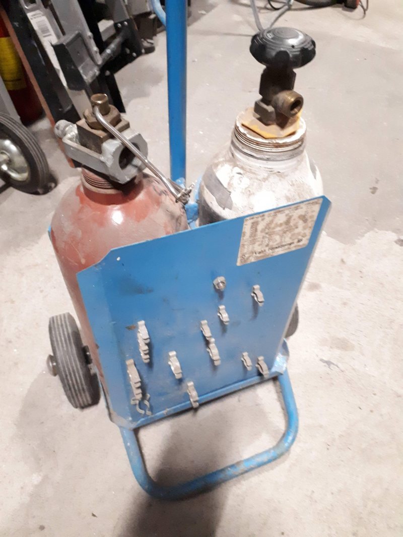 Gasvagn för 5 liters gasflaskor. Hållare för munstycken och diverse tillbehör. 5 liters Acetylen och syrgasflaskor, tomma men lite tryck kvar Adapter för acetylenklocka Saknar tyvärr hattarna till flaskorna. Priside 2000:- Hämtning i Märsta/Sigtuna föredras annars så får väl "Schyssta transporttråden" jobba lite. Numero telefono: NollSjuNollTvåFemNioTreSexNollTvå sms'a gärna så att jag inte misstar okänt nummer för bitcoininformatörer.