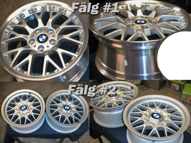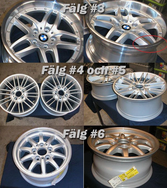 Fälg# 1 Namn: BMW Composite wheel, cross spoke 78 Antal: 1st Mått: 8Jx18 ET: 47 Vikt: 11,226kg Reservdelsnummer: 36116751358 Såldes till: E46, E85 Z4, E86 Z4 Skick: Aldrig monterat Pris: 750kr Fälg #3 Namn: BMW Composite Wheel, Double Spoke 71 Antal: 1st Mått: 9Jx18 ET: 24 Vikt: 11,226kg Reservdelsnummer: 36116752094 Såldes till: E39 Skick: Aldrig monterat, dock skrapade på kanten (inringat på den högra bilden) Övrigt: Pris: 750kr Fälg #4 Namn: BMW Parallel Spoke 85 Antal: 1st Mått: 7½Jx17 ET: 41 Vikt: 10,16kg Reservdelsnummer: 36116752084 Såldes till: E36, E46, Z3 Skick: Aldrig monterat Övrigt: Vänstra fälgen på de två bilderna. Pris: 400kr Fälg #5 Namn: BMW Parallel Spoke 85 Antal: 1st Mått: 8½Jx17 ET: 50 Vikt: 9,37kg Reservdelsnummer: 36116752085 Såldes till: E46 (E36, Z3) Skick: Aldrig monterat Övrigt: Högra fälgen på de två bilderna. Pris: 400kr Fälg #6 Namn: BMW Sports-Spoke Styling II (Styling 27) Antal: 1st Mått: 7Jx15 ET: 47 Vikt: 7,95kg Reservdelsnummer: 36111182608 Såldes till: E36, E46, Z3 Skick: Aldrig monterat Övrigt: Pris: 300kr OBS! Ej kompletta uppsättningar, dvs endast det antal fälgar som är listade under "Antal" vid respektive fälg. _________________