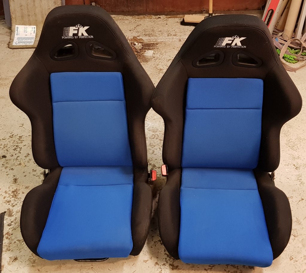 FK-stolar med medföljande hemmagjorda fästplåtar för att passa i BMW e30, om man vill det. Gjort för att funka med vanliga 3-punktsbältet.