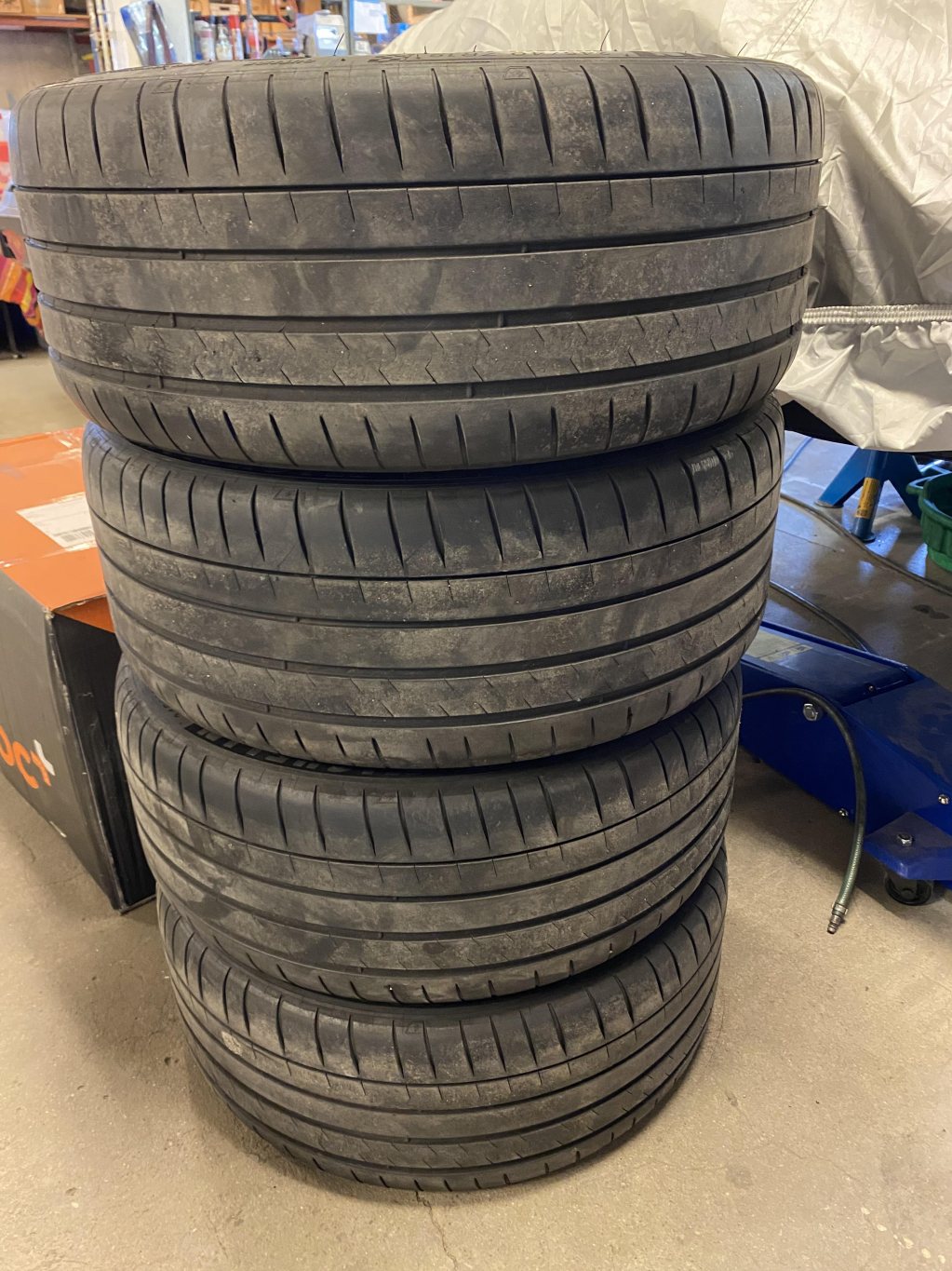 I originaldimension för bl.a. BMW 5-serie (F10/11) fyra stycken Michelin Pilot Sport 4 S i 245/40-19. Två har ca 5mm kvar, två har ca 4mm. Tillverkade vecka 46 2019, uttagna till sommaren 2020.