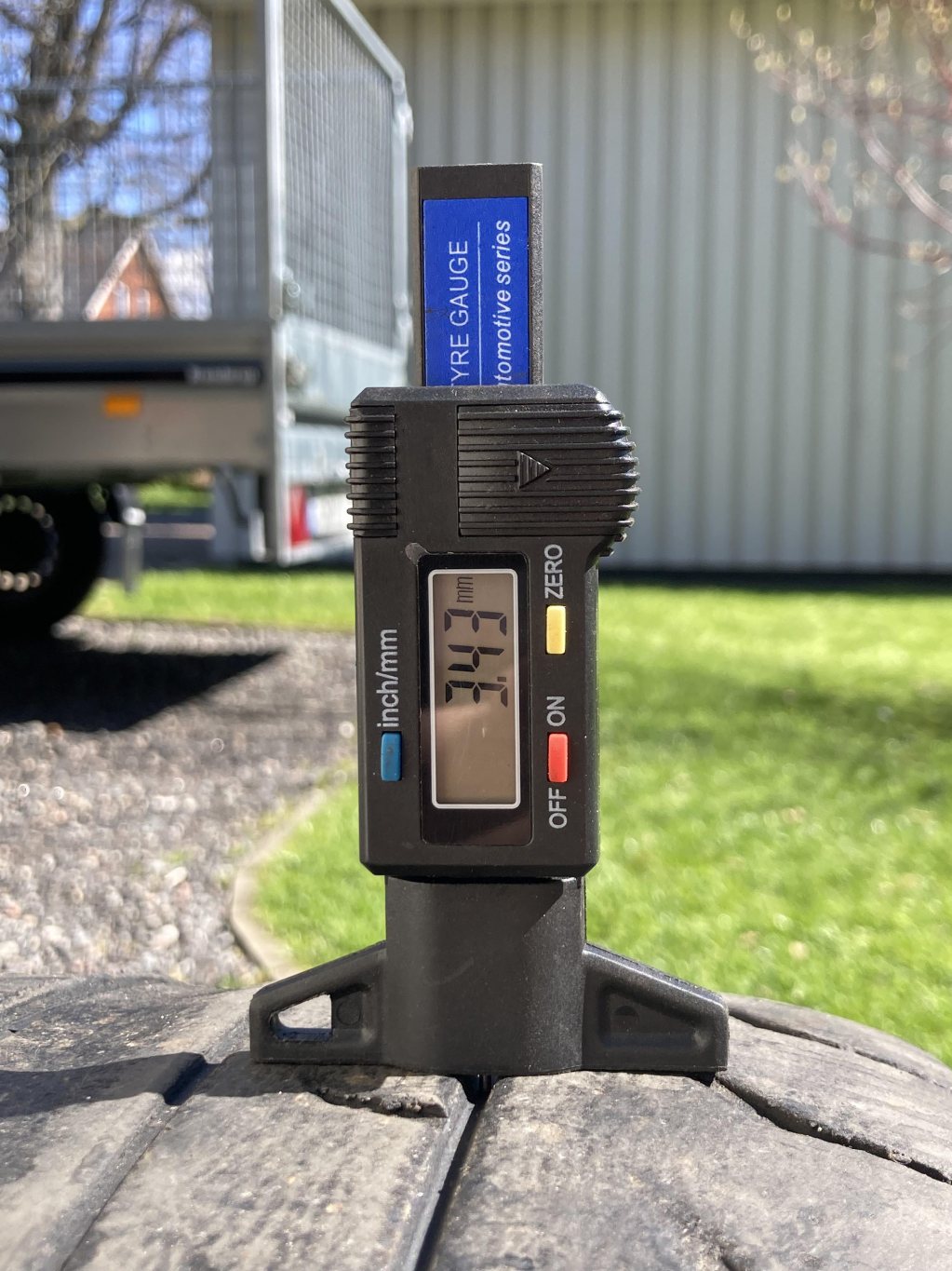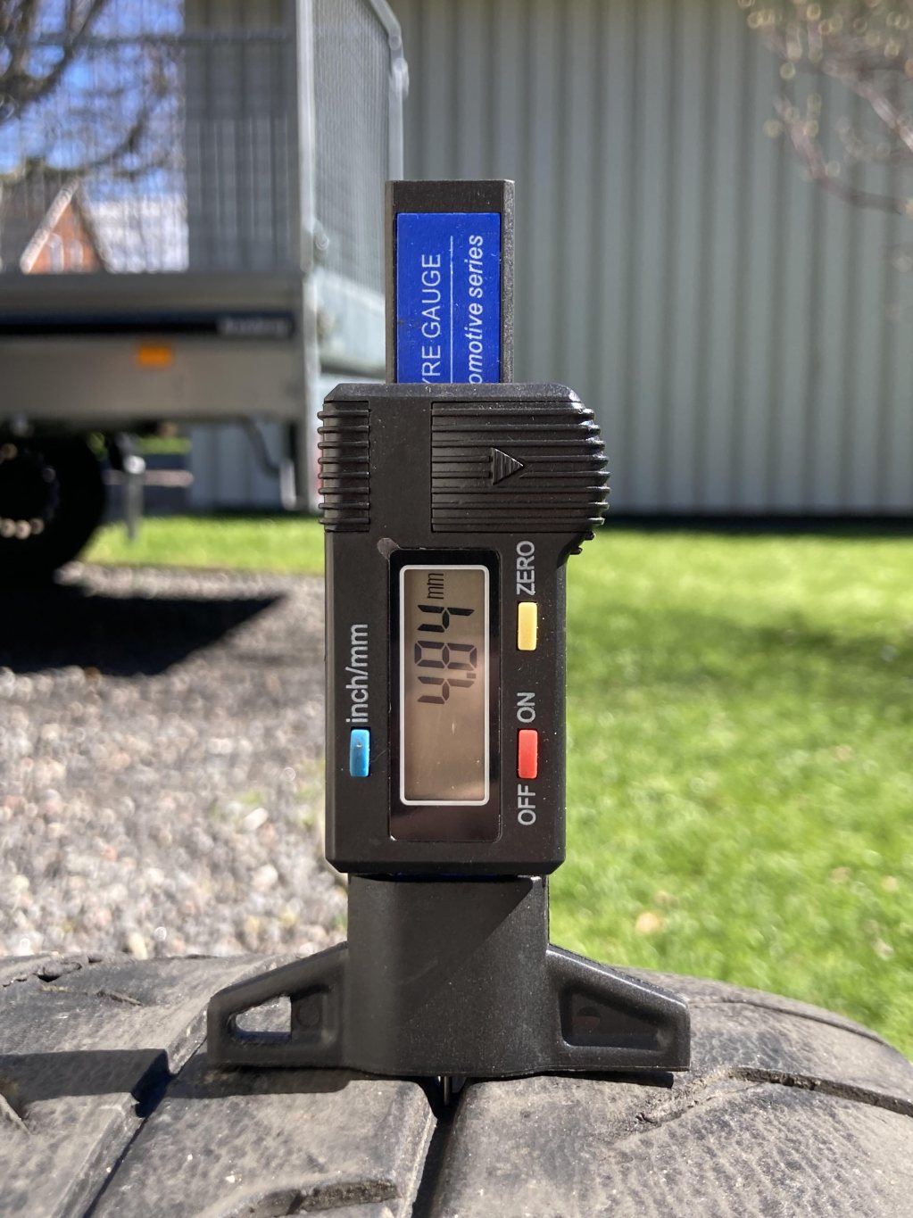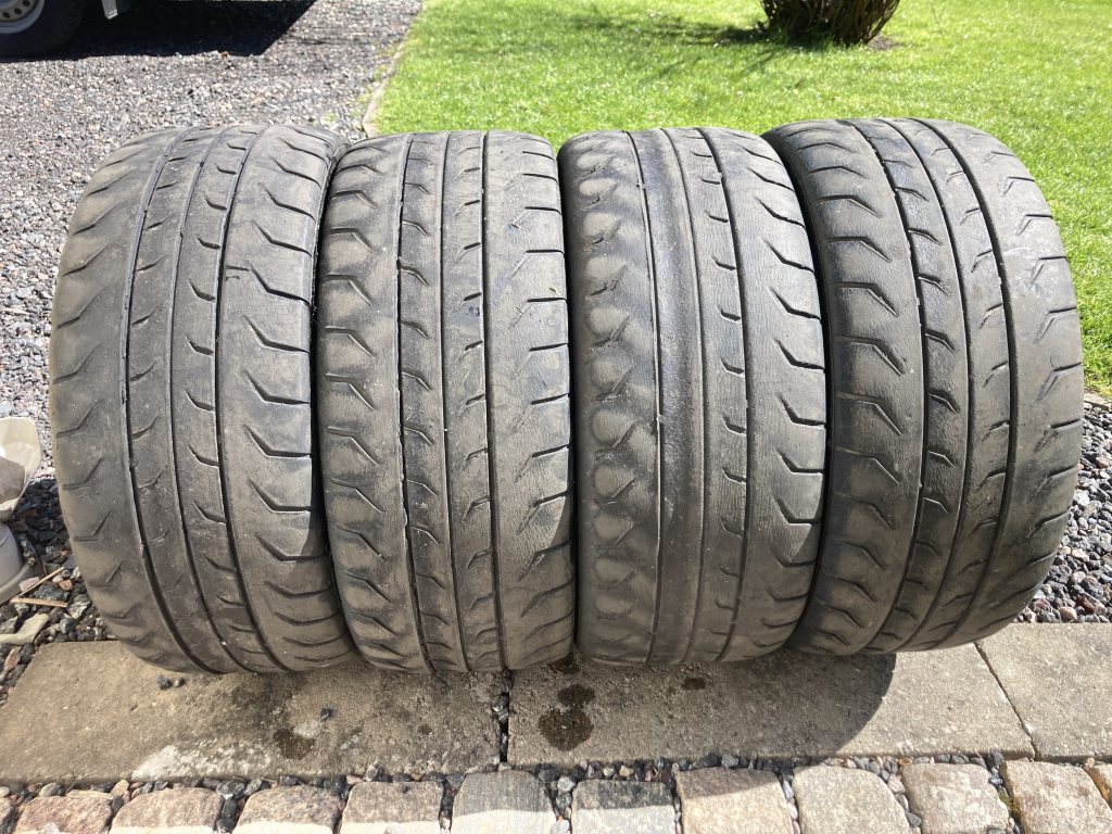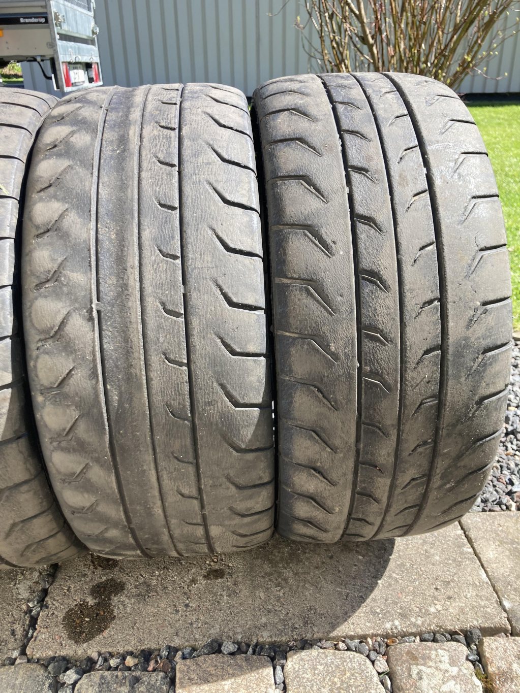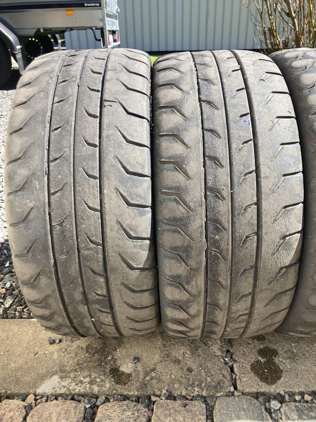Skick enligt bilder, ett däck slitet lite en bit in från kanten, övriga jämnslitna.